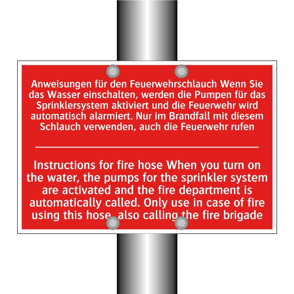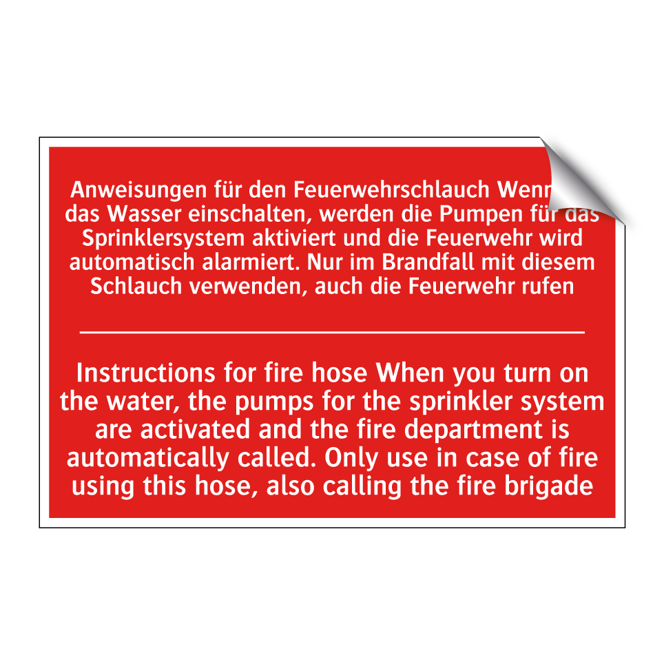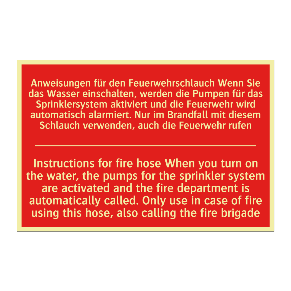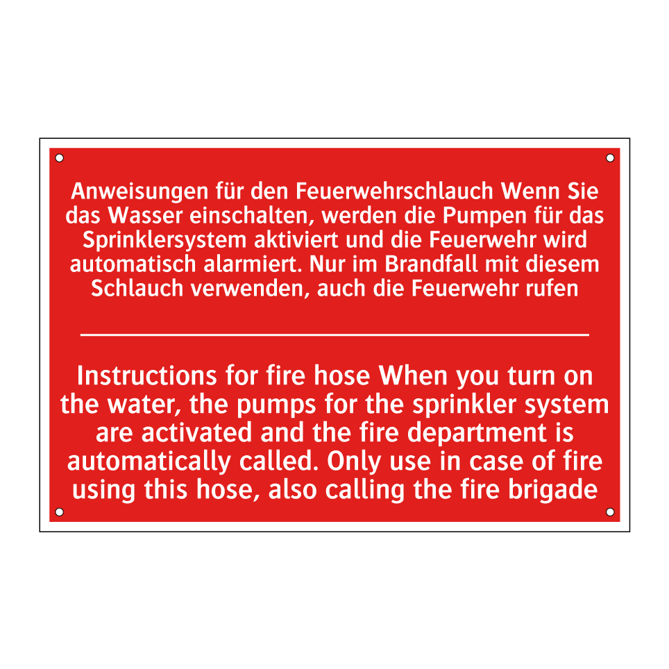 Zweisprachiges Brandschutzschild mit deutschem Text Anweisungen für den Feuerwehrschlauch Wenn Sie das Wasser einschalten, werden die Pumpen für das Sprinklersystem aktiviert und die Feuerwehr wird automatisch alarmiert. Nur im Brandfall mit diesem Schlauch verwenden, auch die Feuerwehr rufen und englischem Text Instructions for fire hose When you turn on the water, the pumps for the sprinkler system are activated and the fire department is automatically called. Only use in case of fire using this hose, also calling the fire brigade
