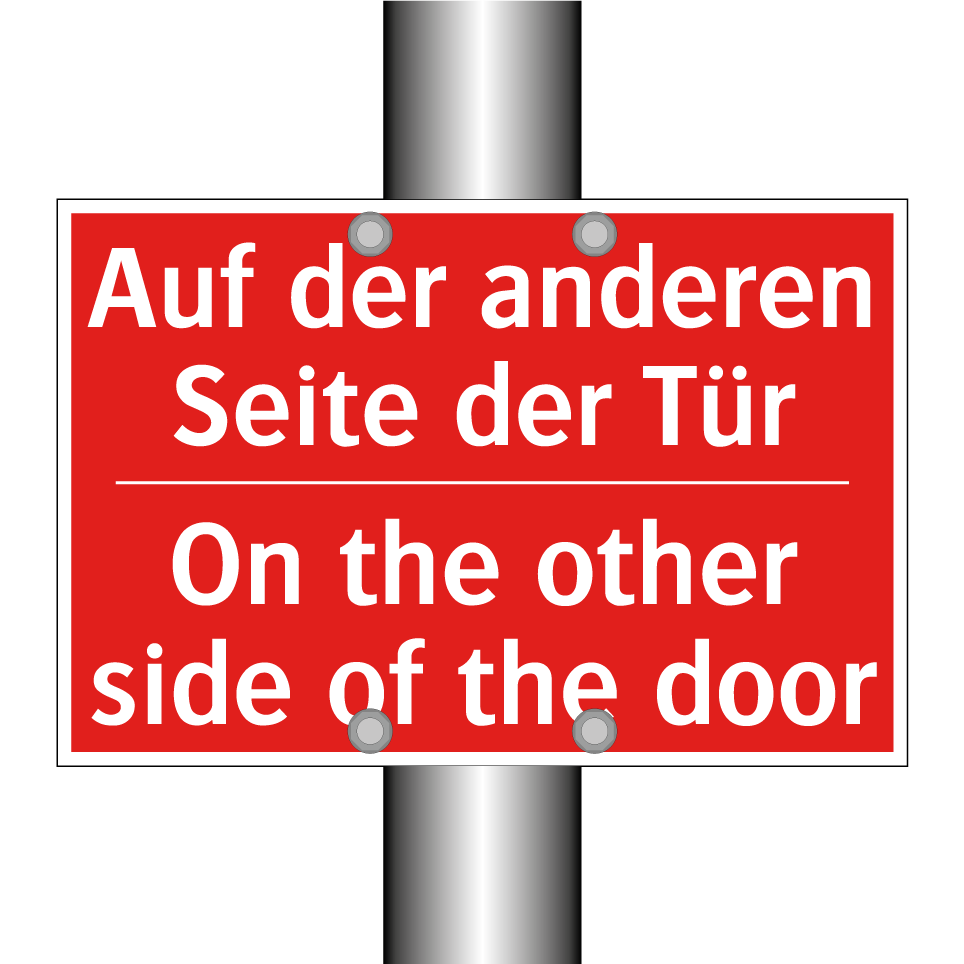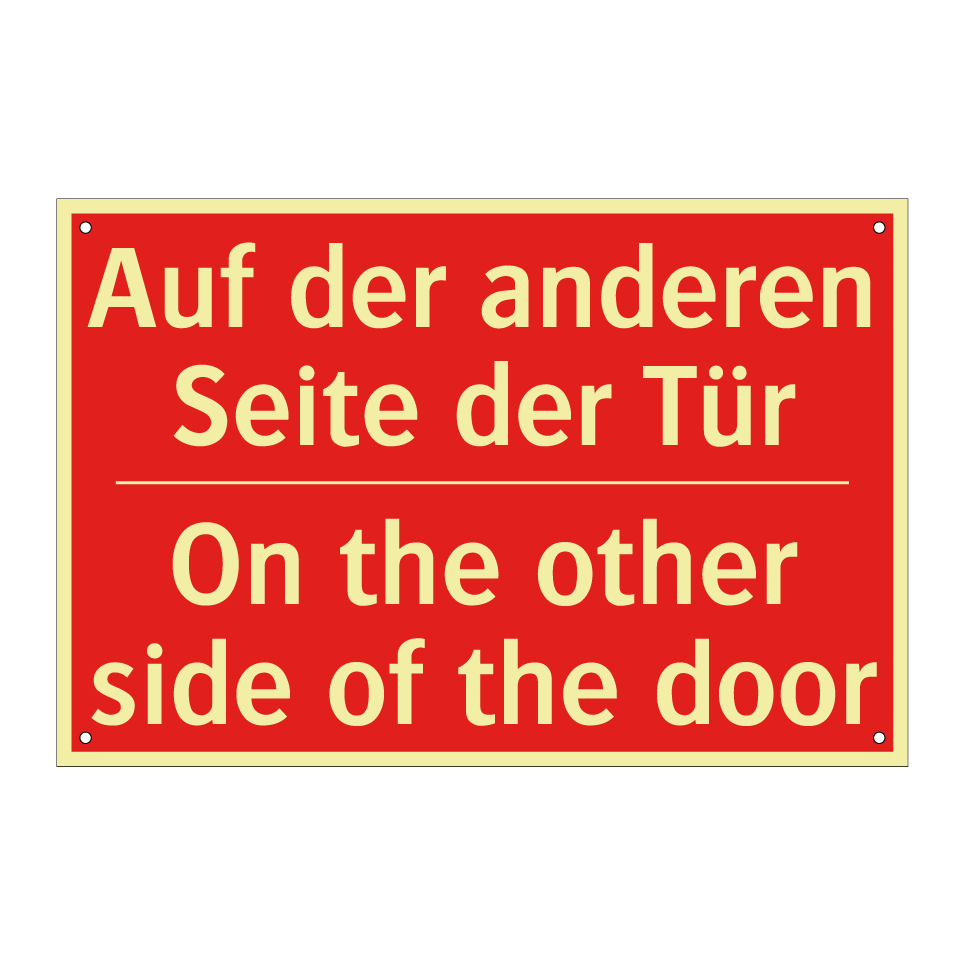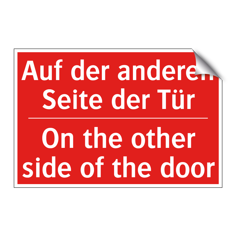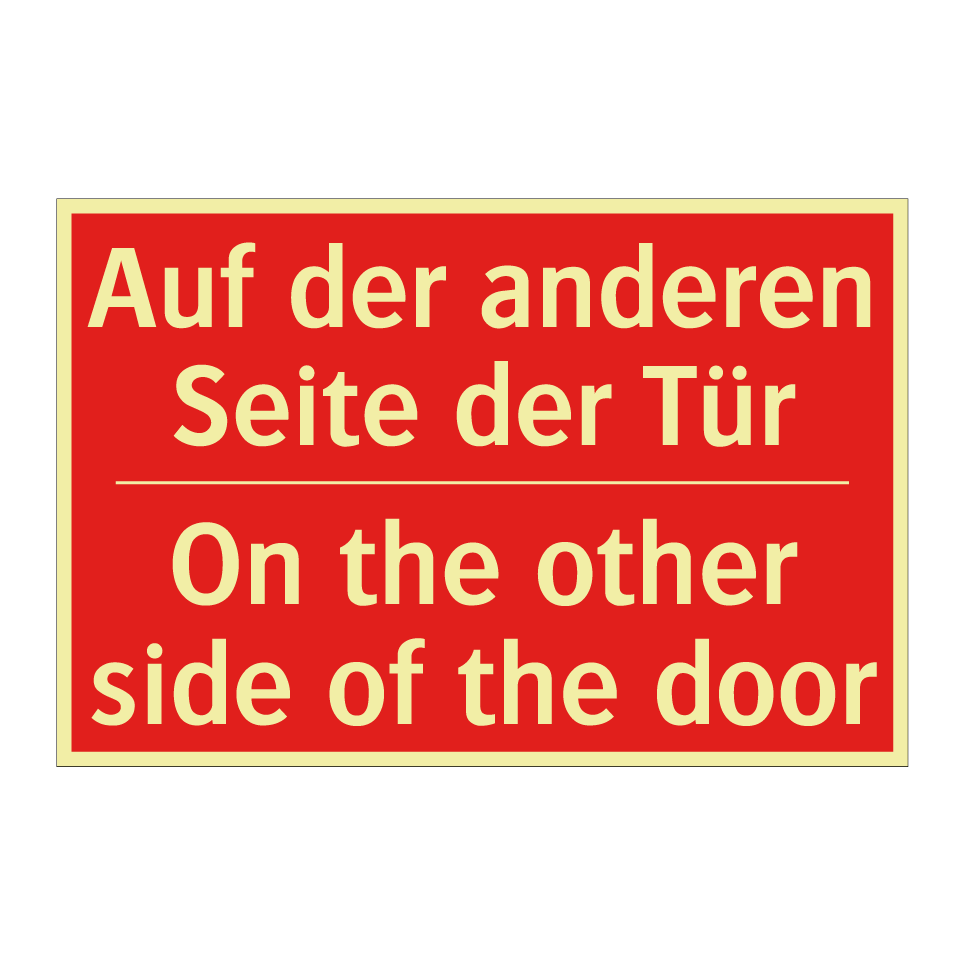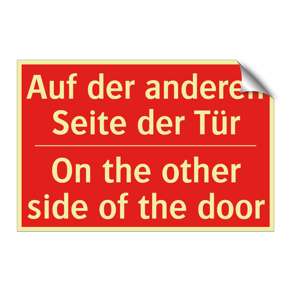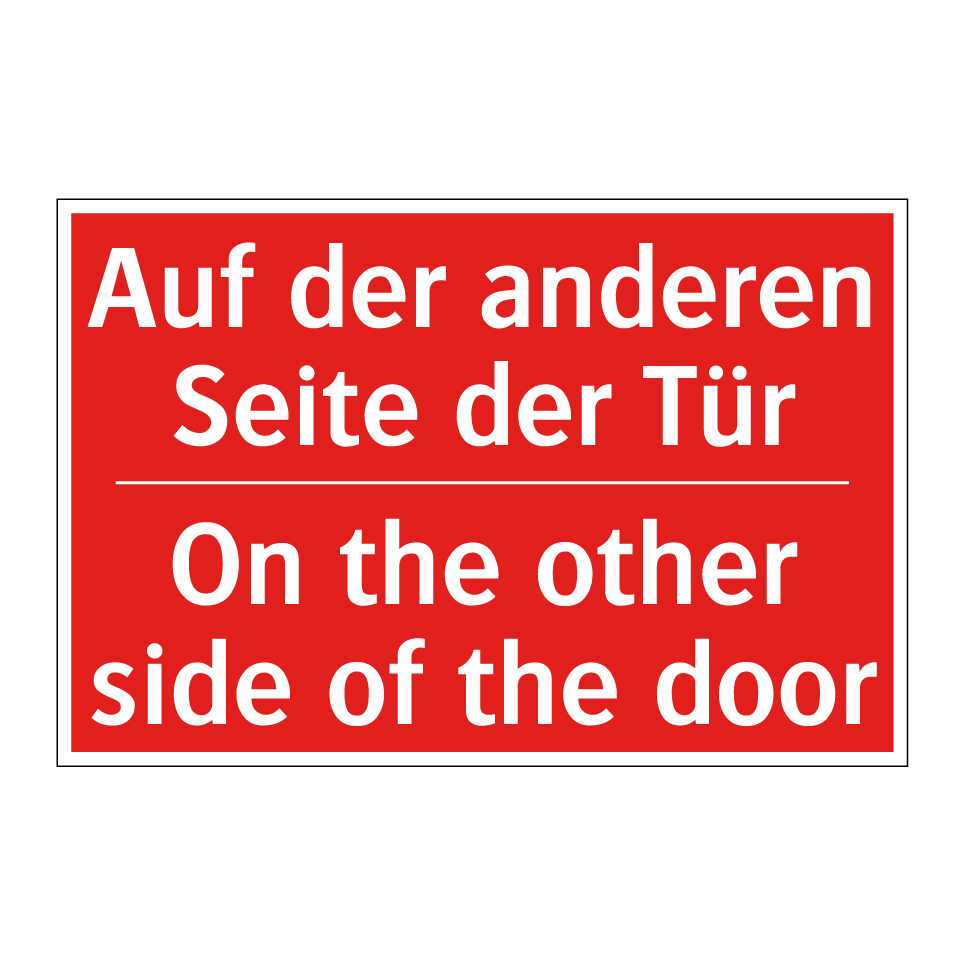 Zweisprachiges Brandschutzschild mit deutschem Text Auf der anderen Seite der Tür und englischem Text On the other side of the door