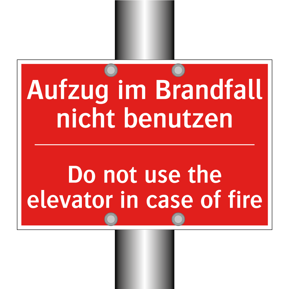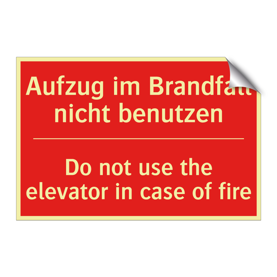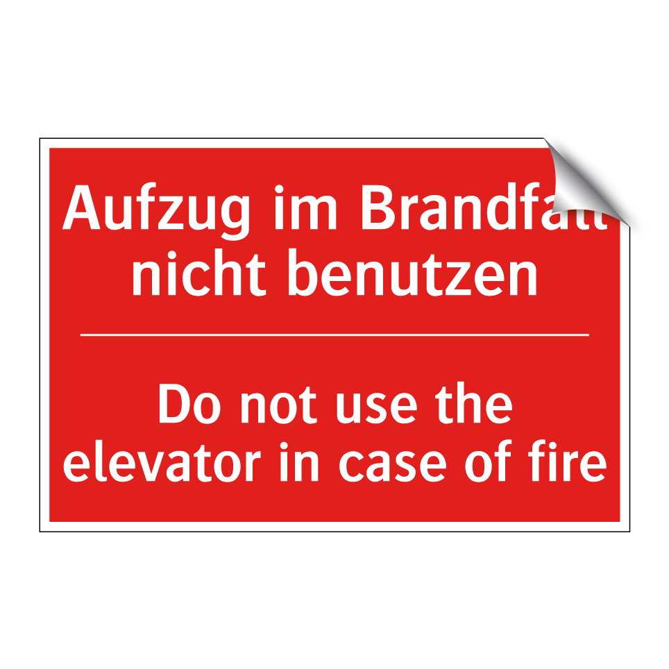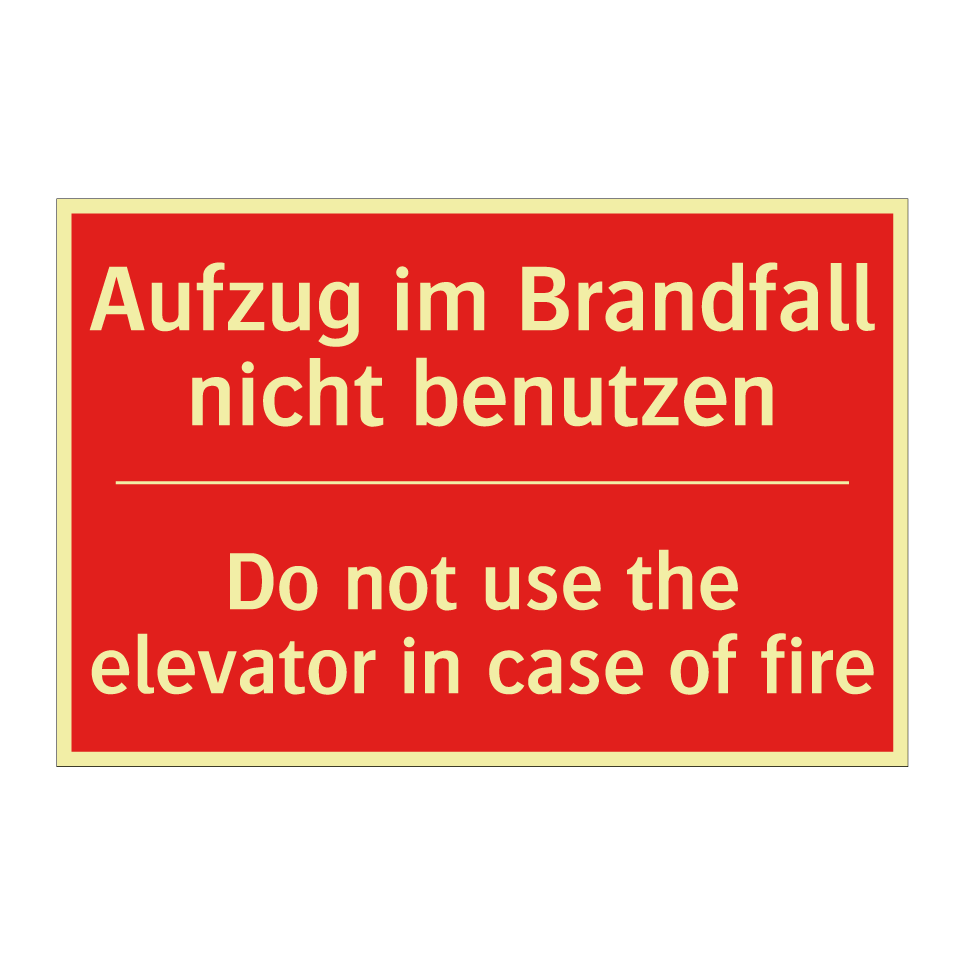 Zweisprachiges Brandschutzschild mit deutschem Text Aufzug im Brandfall nicht benutzen und englischem Text Do not use the elevator in case of fire