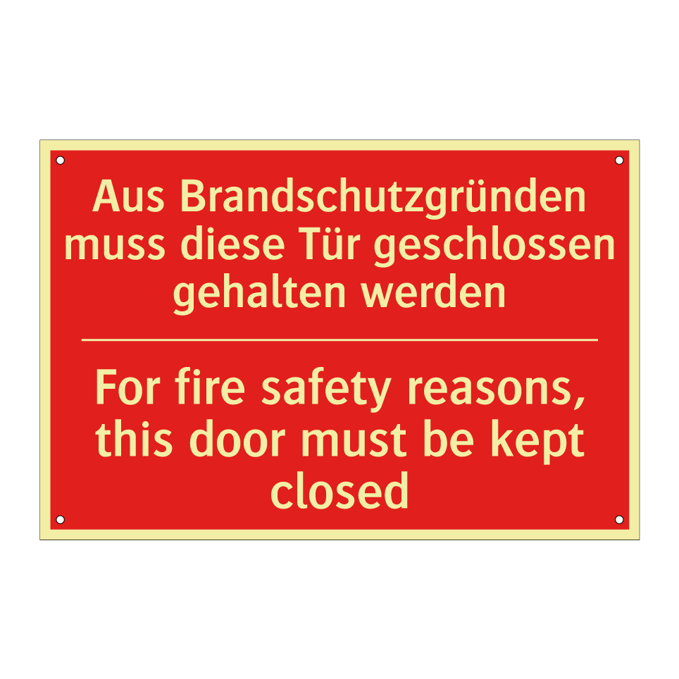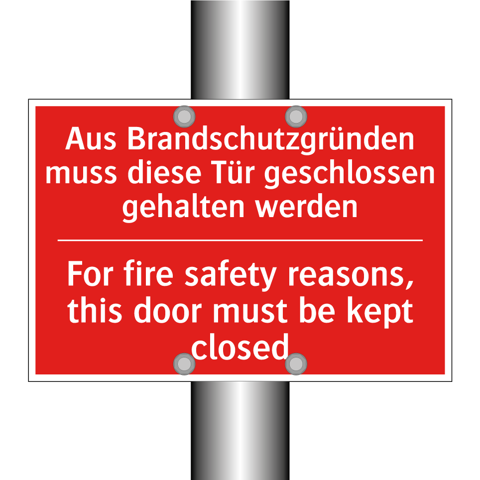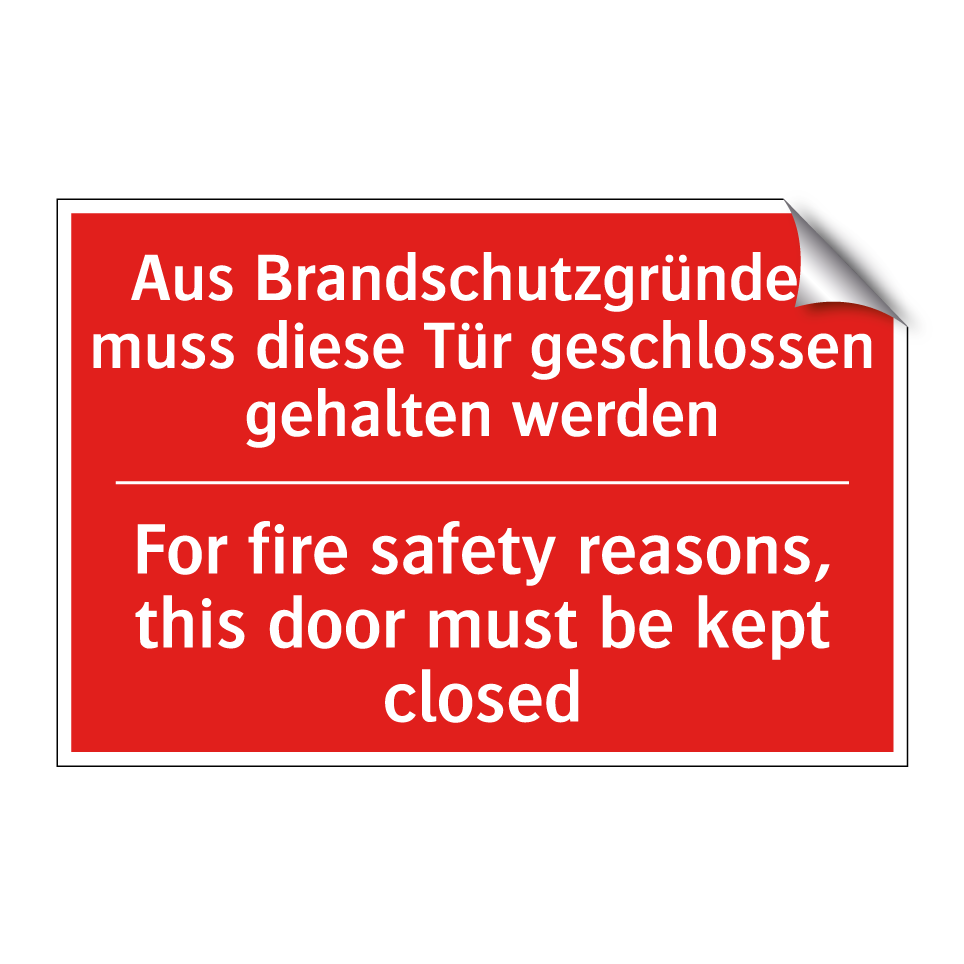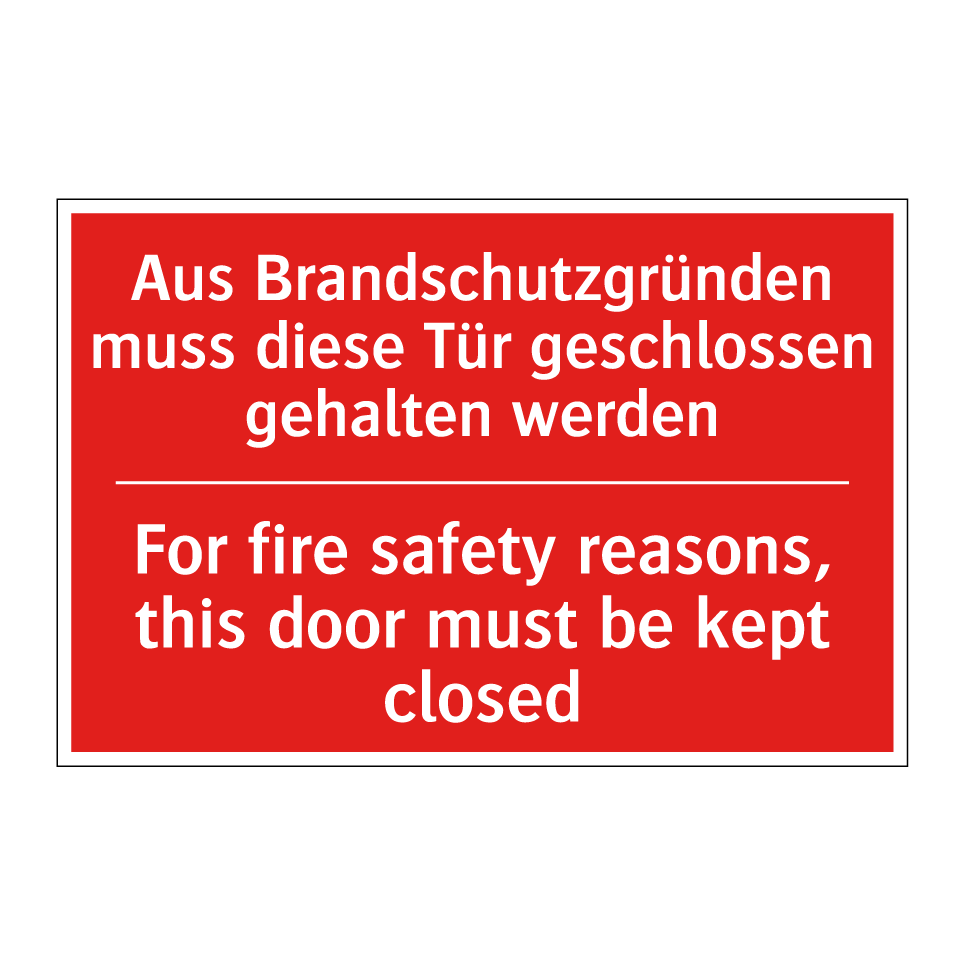 Zweisprachiges Brandschutzschild mit deutschem Text Aus Brandschutzgründen muss diese Tür geschlossen gehalten werden und englischem Text For fire safety reasons, this door must be kept closed