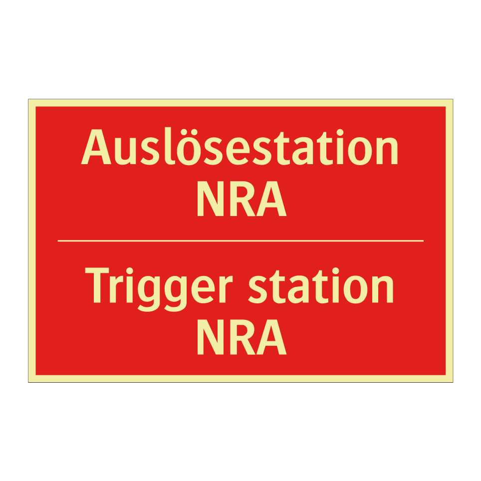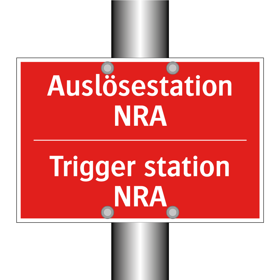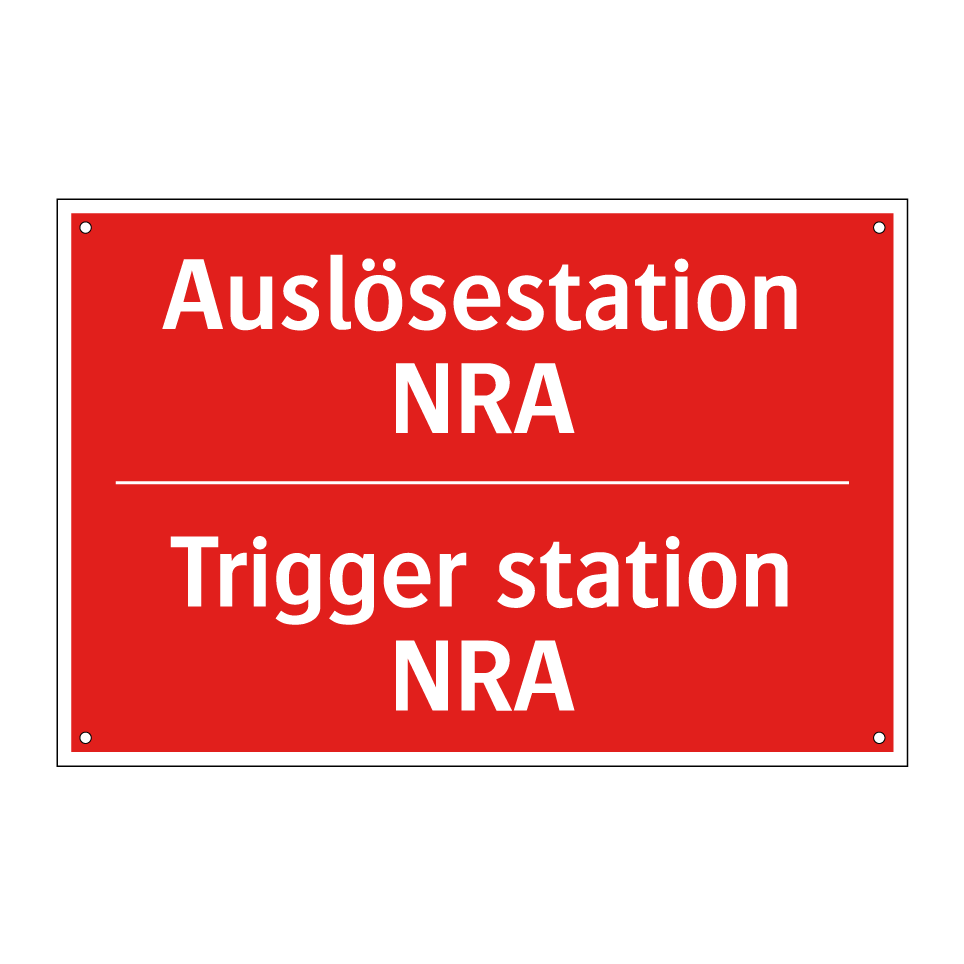 Zweisprachiges Brandschutzschild mit deutschem Text Auslösestation NRA und englischem Text Trigger station NRA