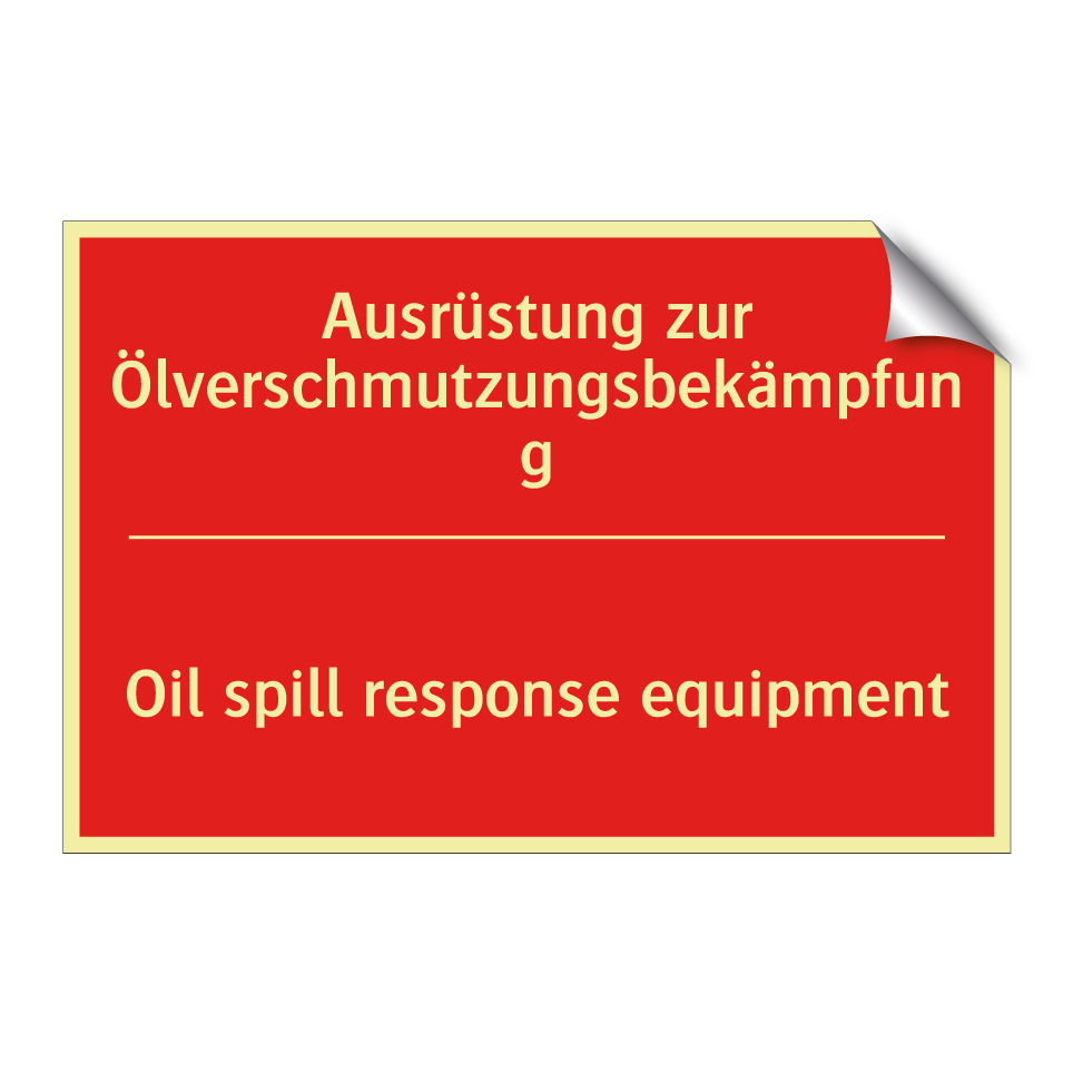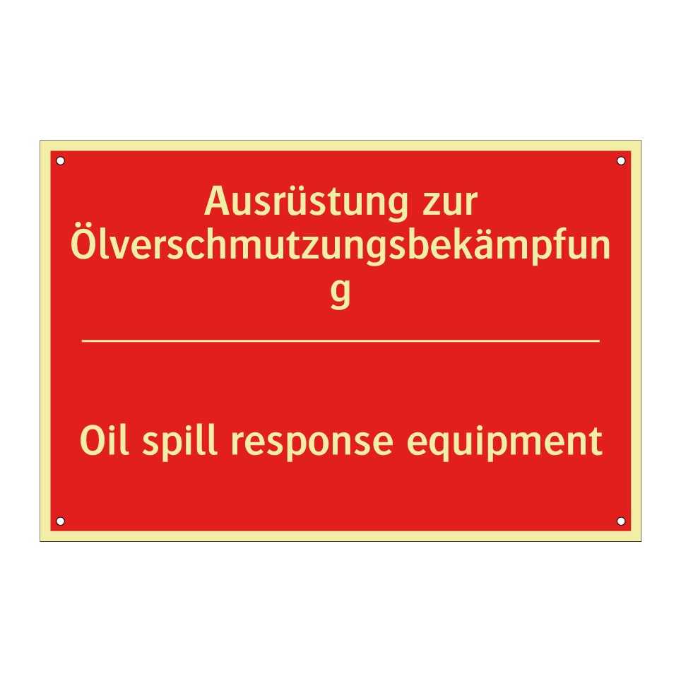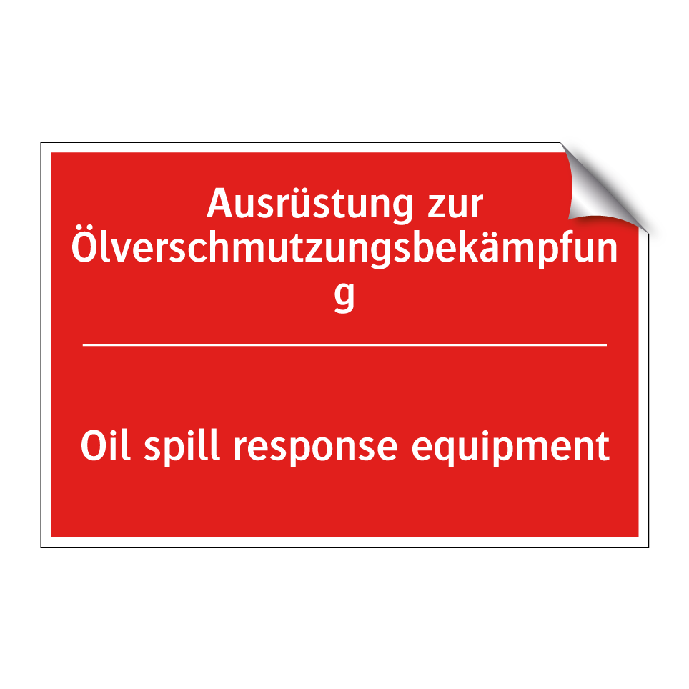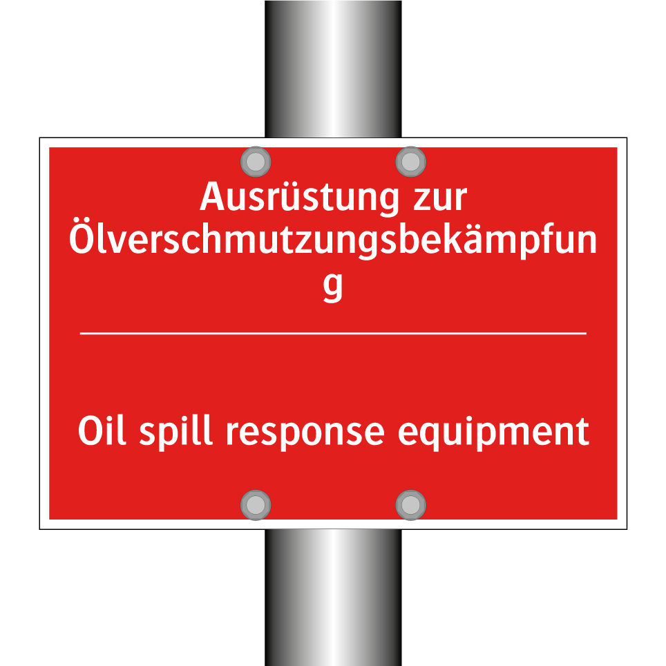 Zweisprachiges Brandschutzschild mit deutschem Text Ausrüstung zur Ölverschmutzungsbekämpfung und englischem Text Oil spill response equipment