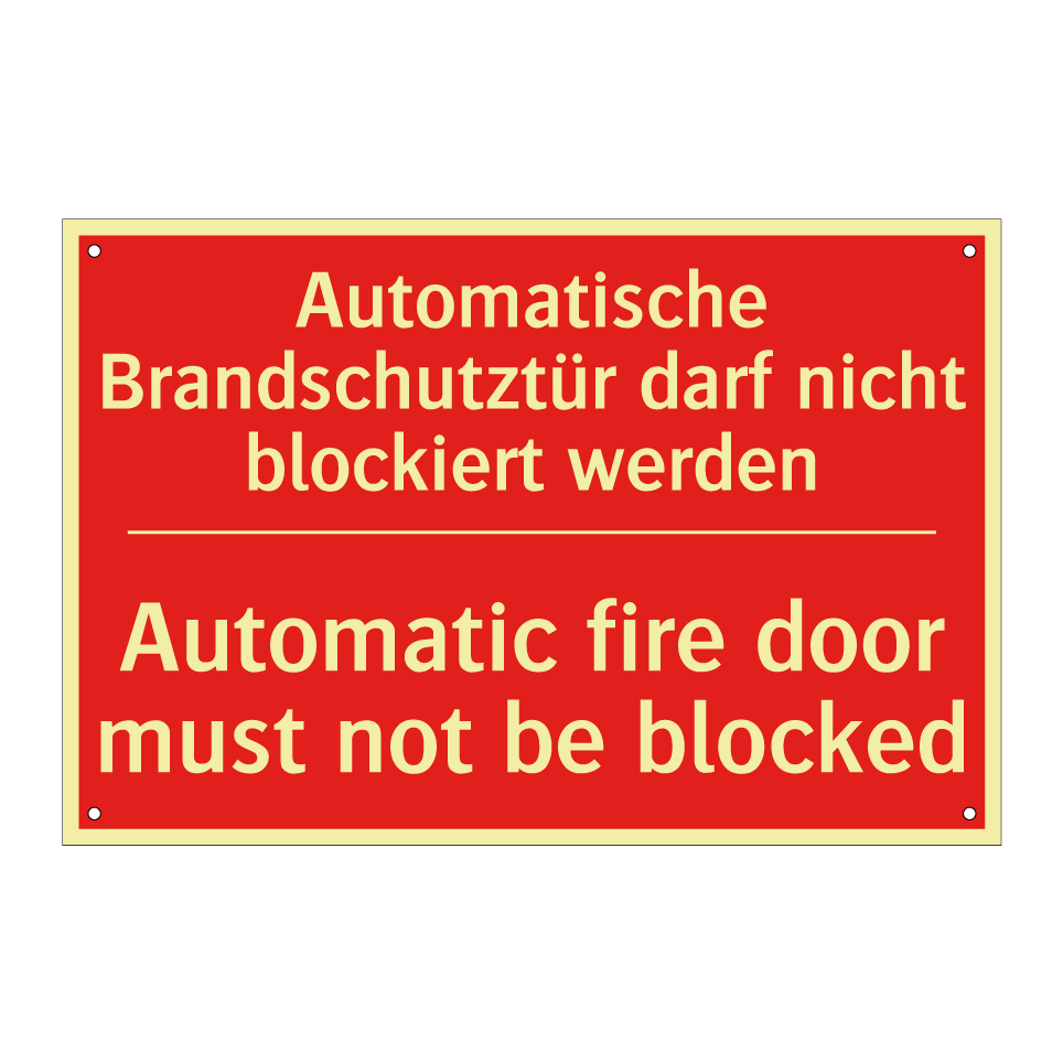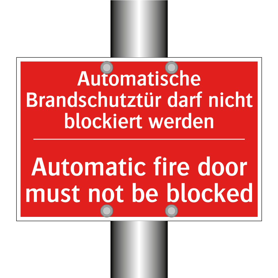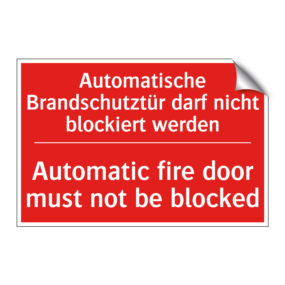 Zweisprachiges Brandschutzschild mit deutschem Text Automatische Brandschutztür darf nicht blockiert werden und englischem Text Automatic fire door must not be blocked
