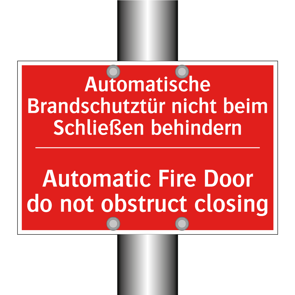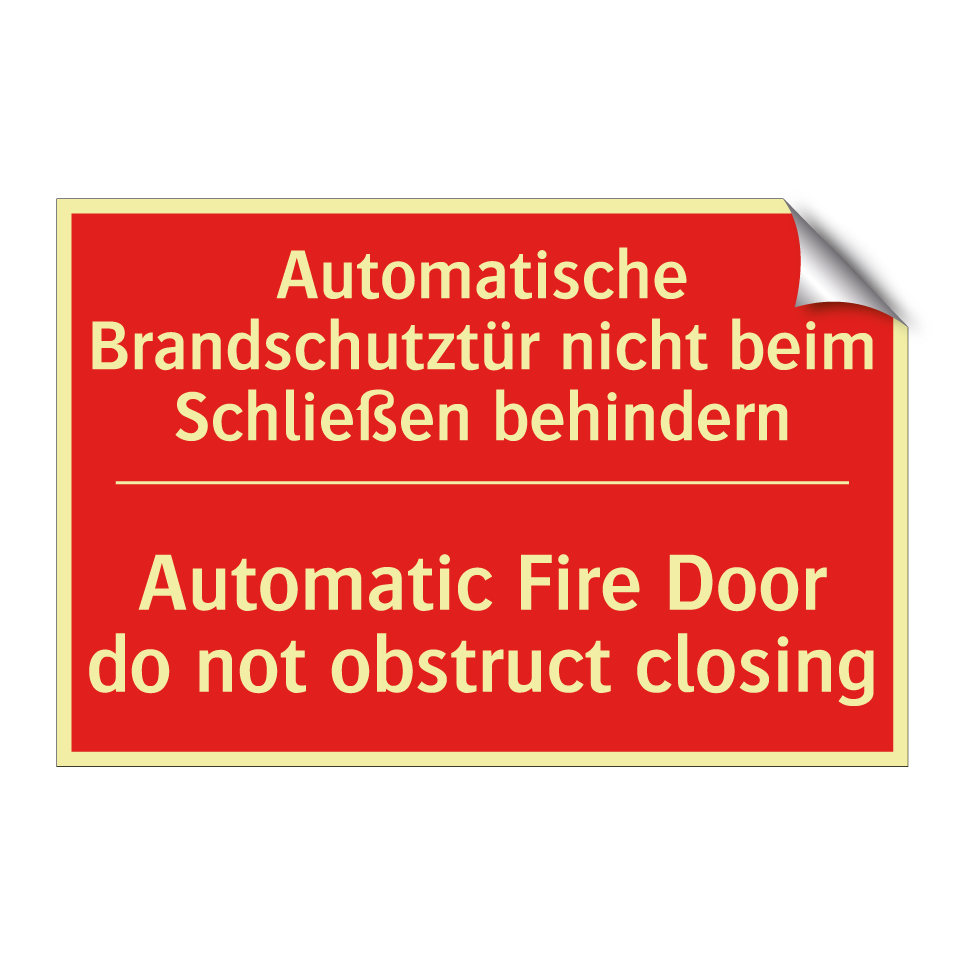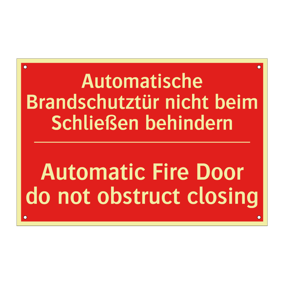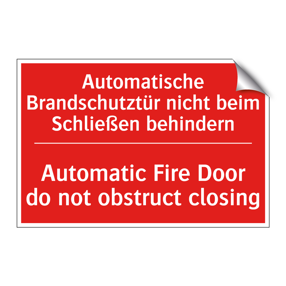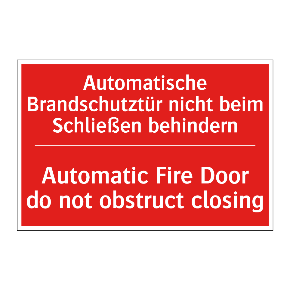 Zweisprachiges Brandschutzschild mit deutschem Text Automatische Brandschutztür nicht beim Schließen behindern und englischem Text Automatic Fire Door do not obstruct closing