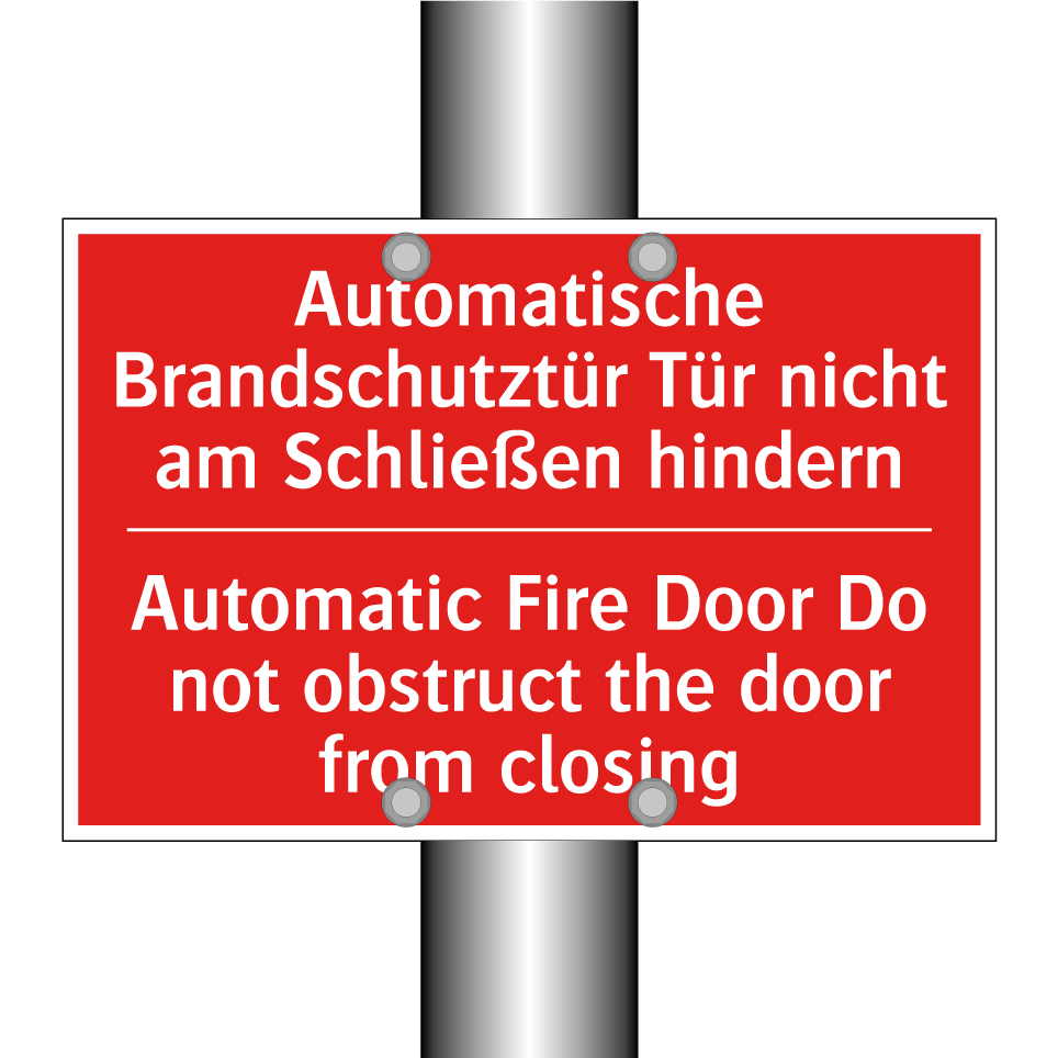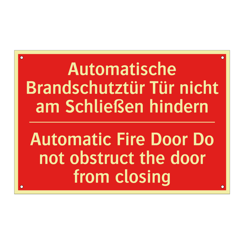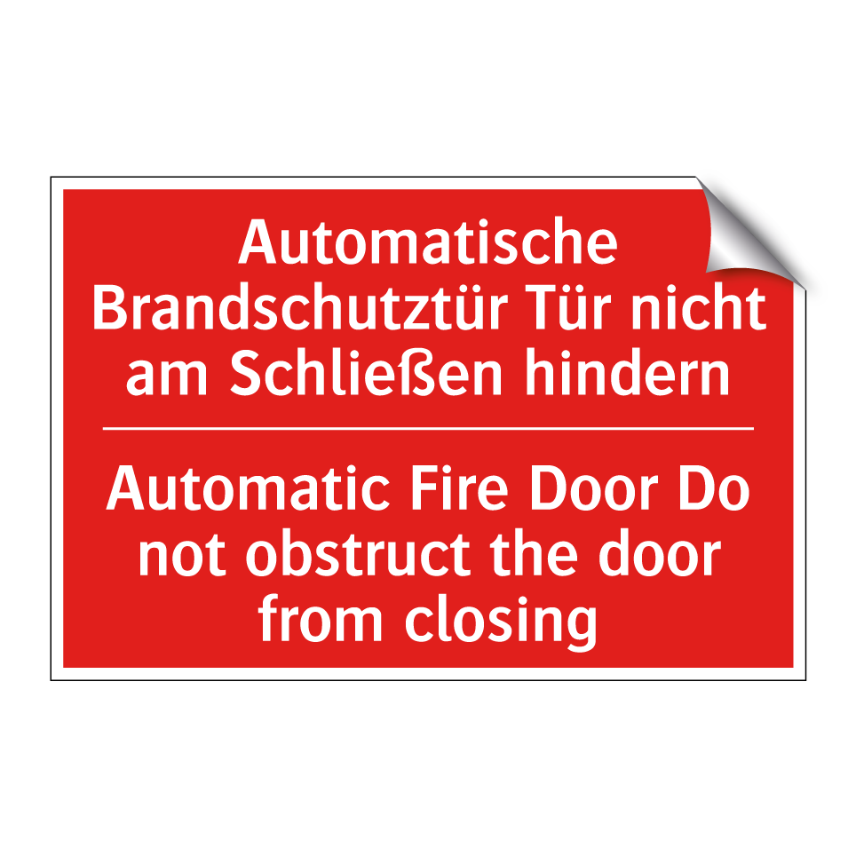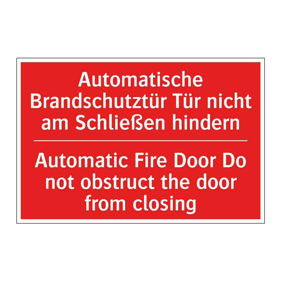 Zweisprachiges Brandschutzschild mit deutschem Text Automatische Brandschutztür Tür nicht am Schließen hindern und englischem Text Automatic Fire Door Do not obstruct the door from closing