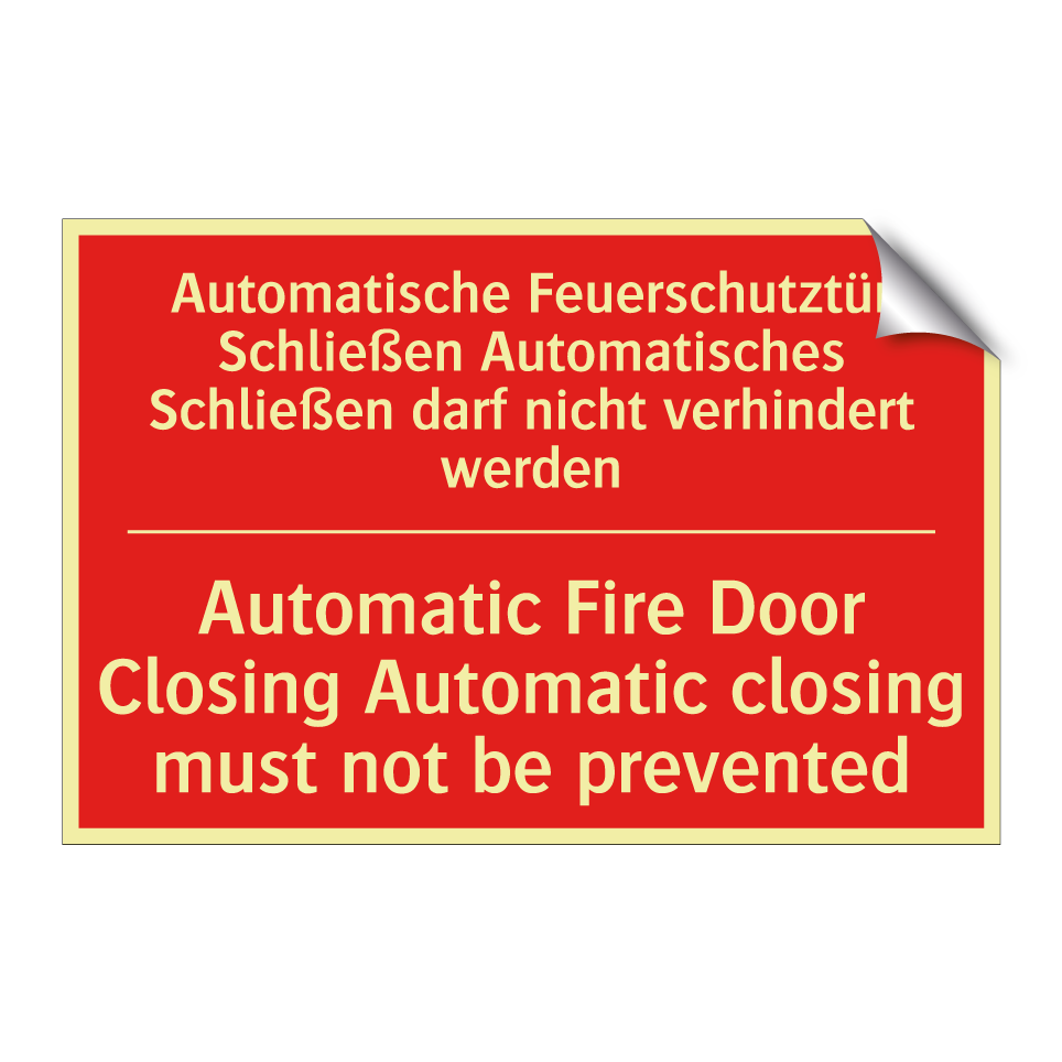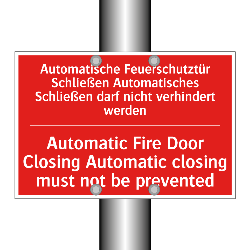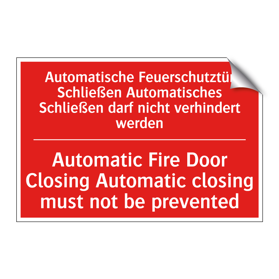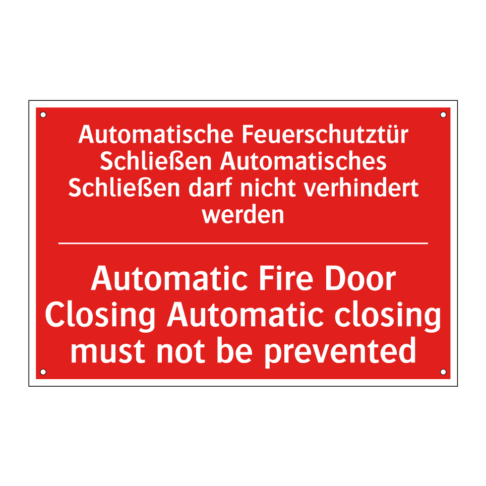 Zweisprachiges Brandschutzschild mit deutschem Text Automatische Feuerschutztür Schließen Automatisches Schließen darf nicht verhindert werden und englischem Text Automatic Fire Door Closing Automatic closing must not be prevented