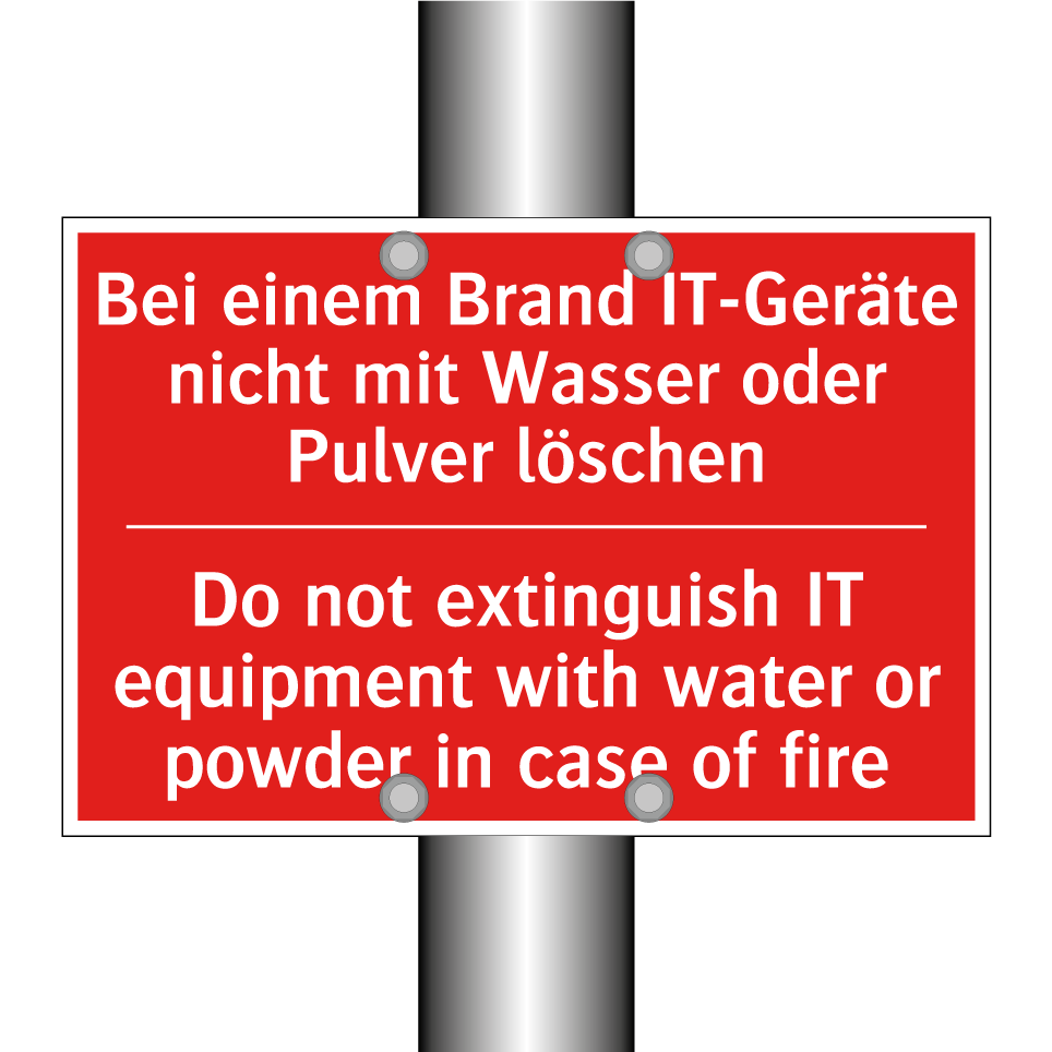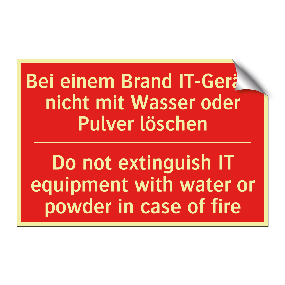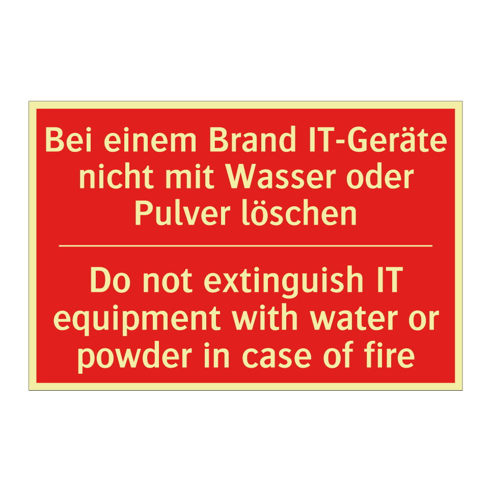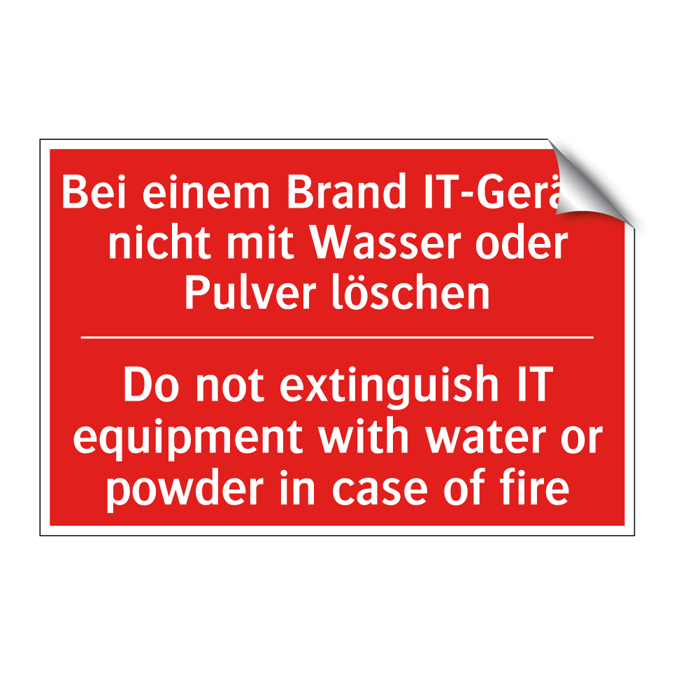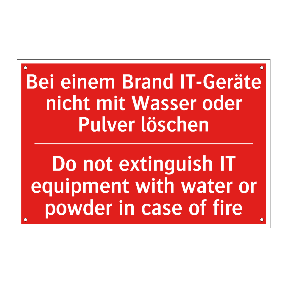 Zweisprachiges Brandschutzschild mit deutschem Text Bei einem Brand IT-Geräte nicht mit Wasser oder Pulver löschen und englischem Text Do not extinguish IT equipment with water or powder in case of fire
