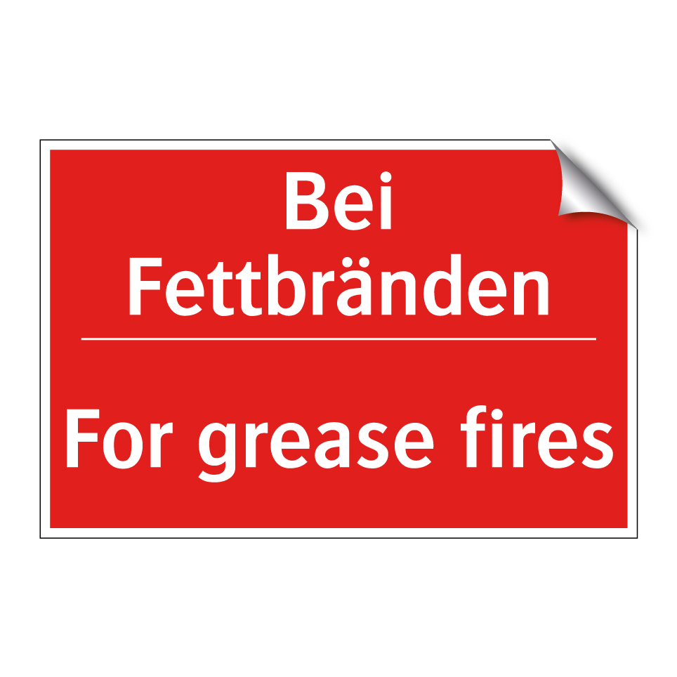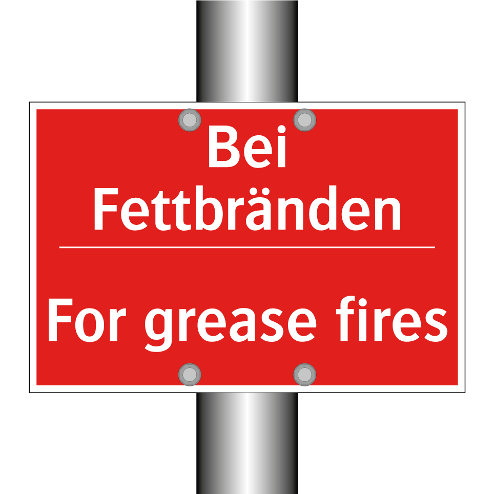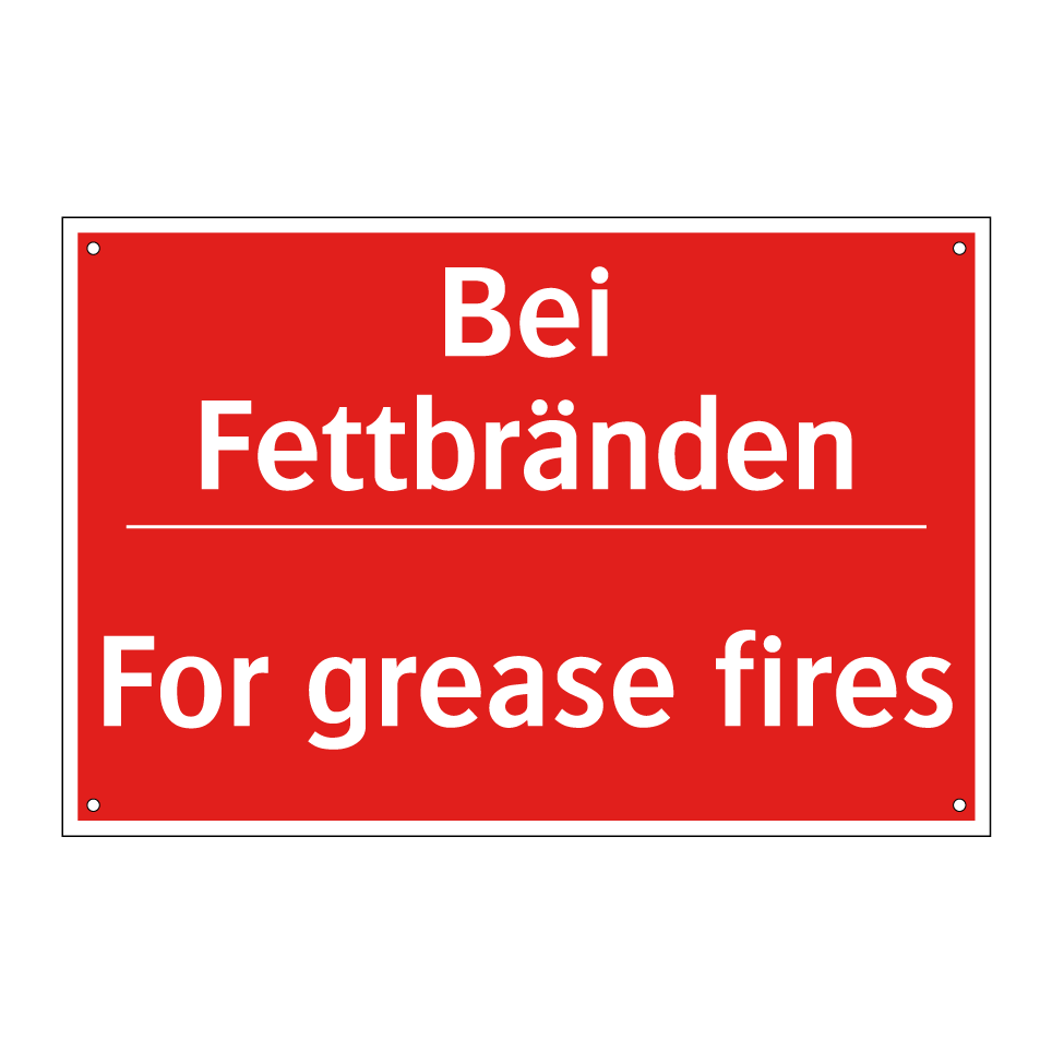 Zweisprachiges Brandschutzschild mit deutschem Text Bei Fettbränden und englischem Text For grease fires