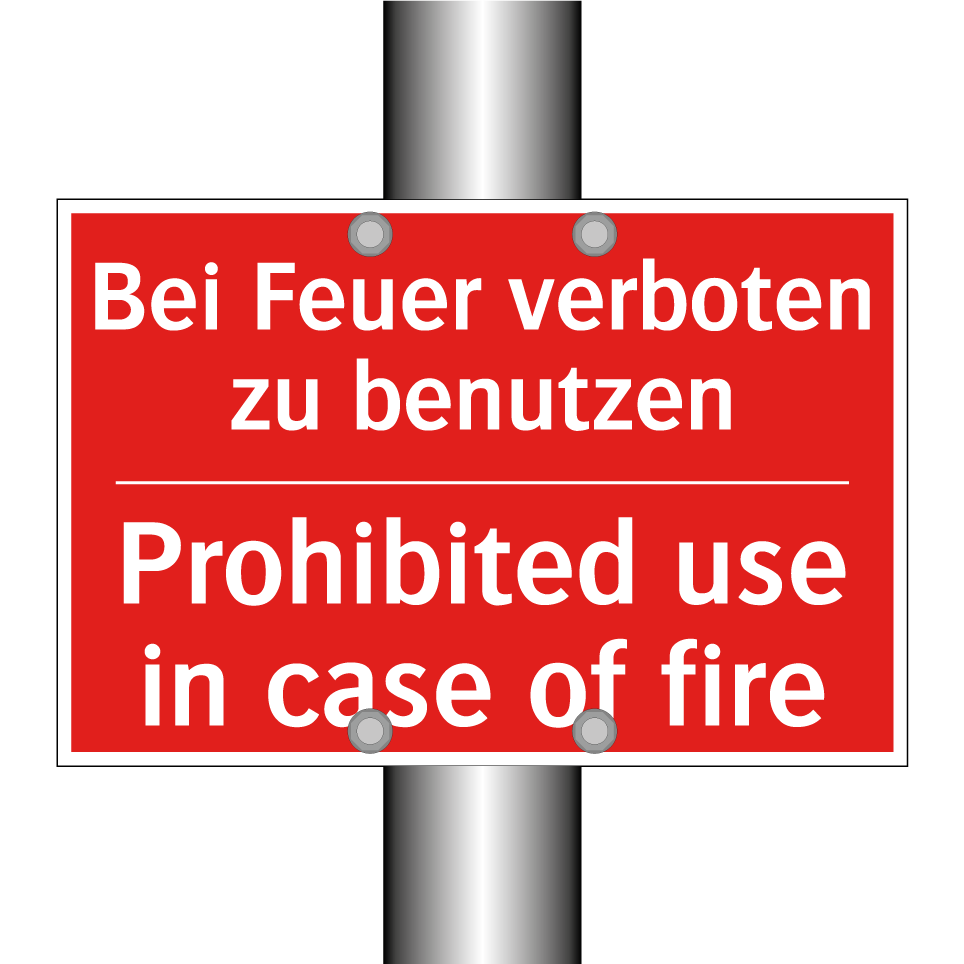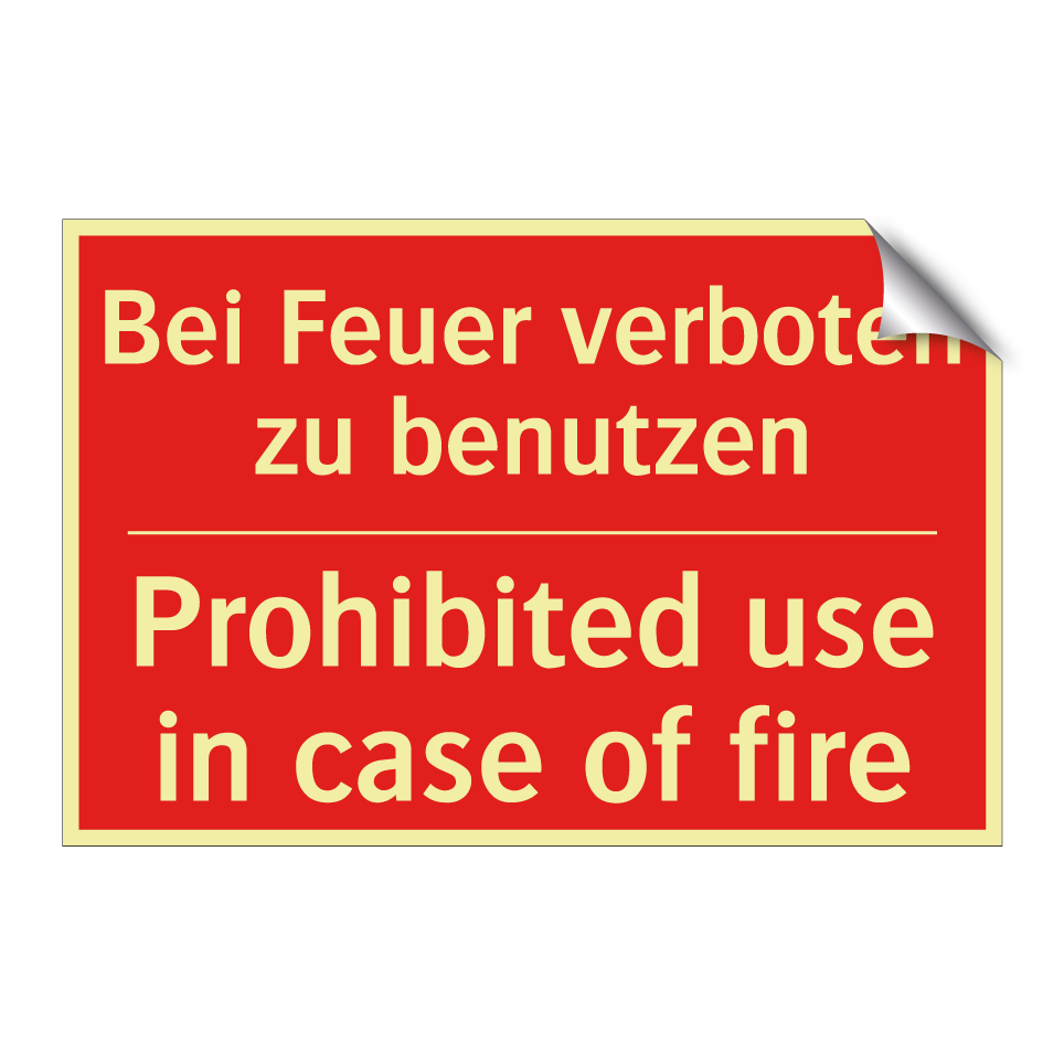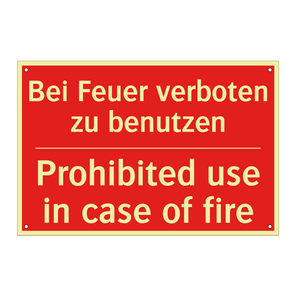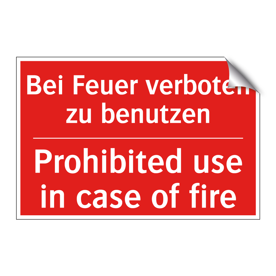 Zweisprachiges Brandschutzschild mit deutschem Text Bei Feuer verboten zu benutzen und englischem Text Prohibited use in case of fire