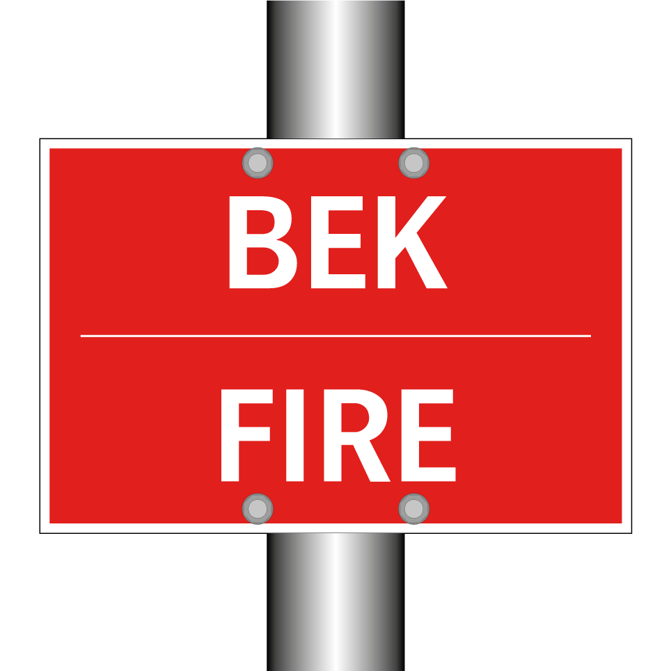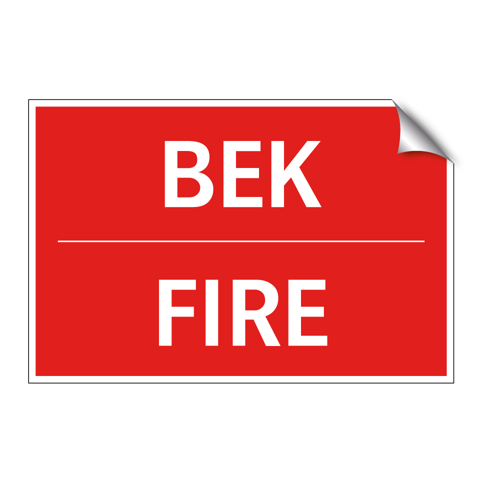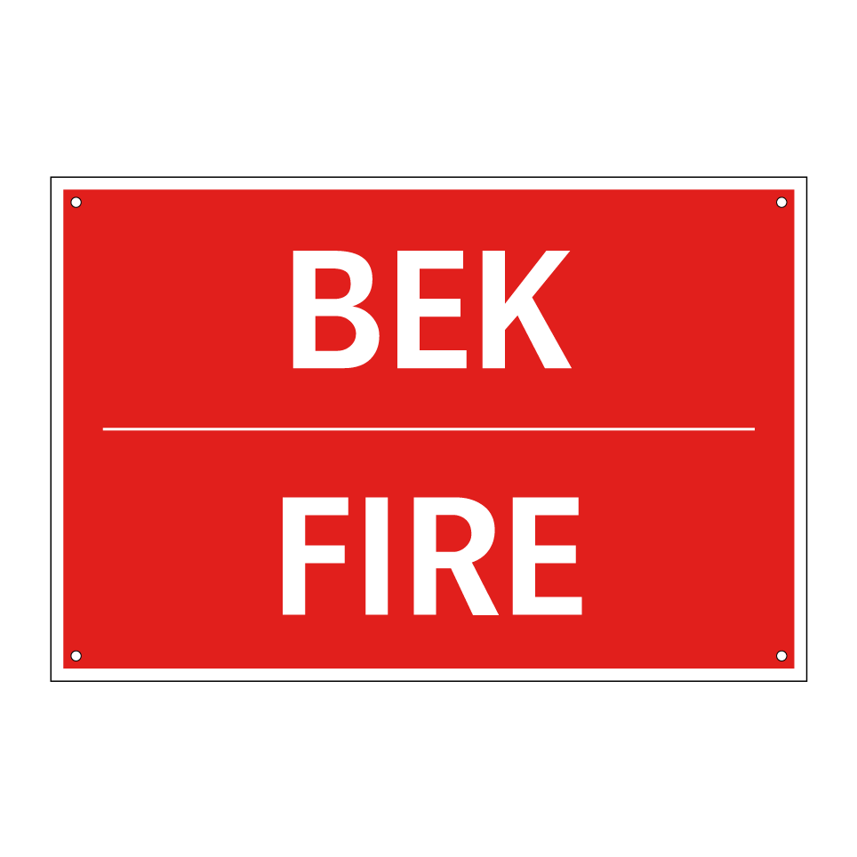 Zweisprachiges Brandschutzschild mit deutschem Text BEK und englischem Text FIRE