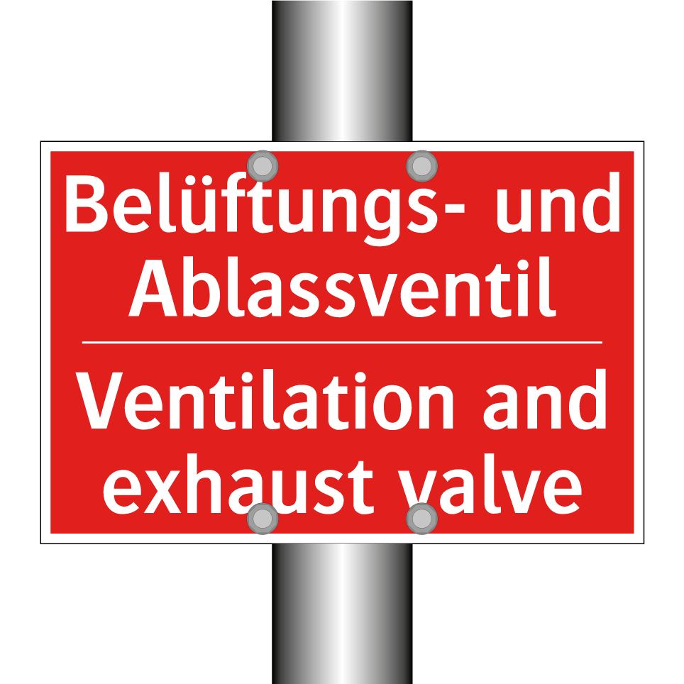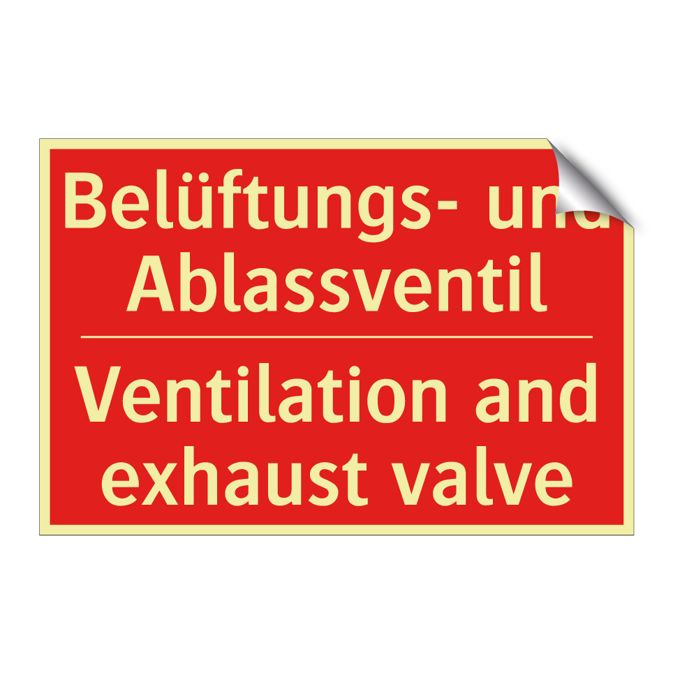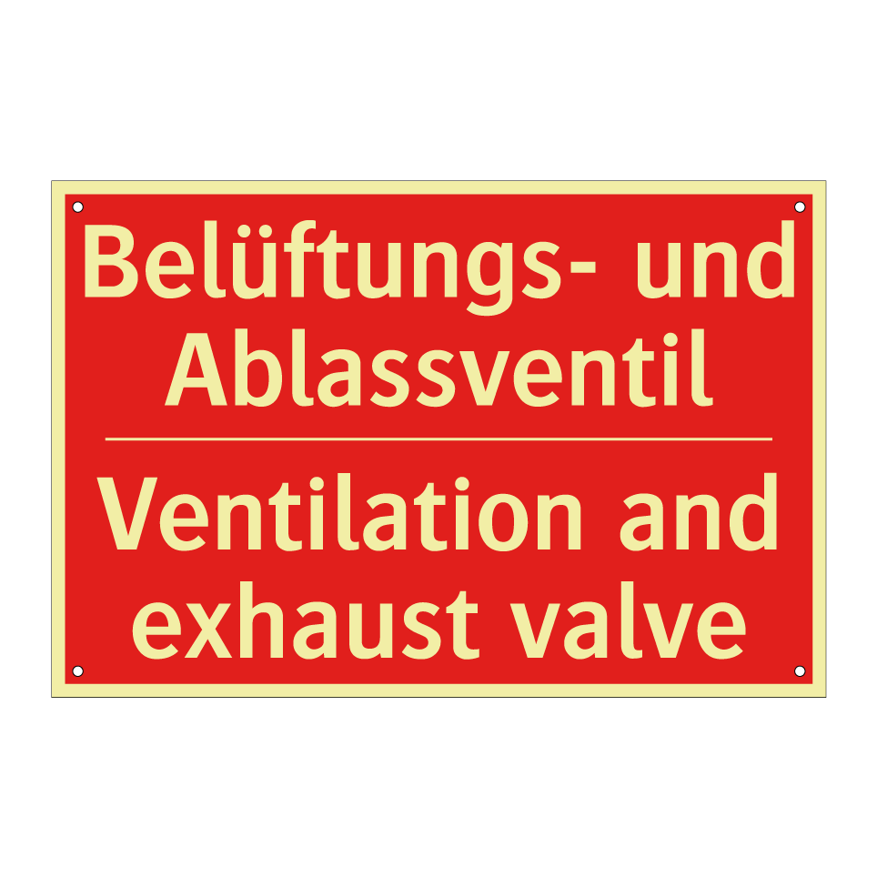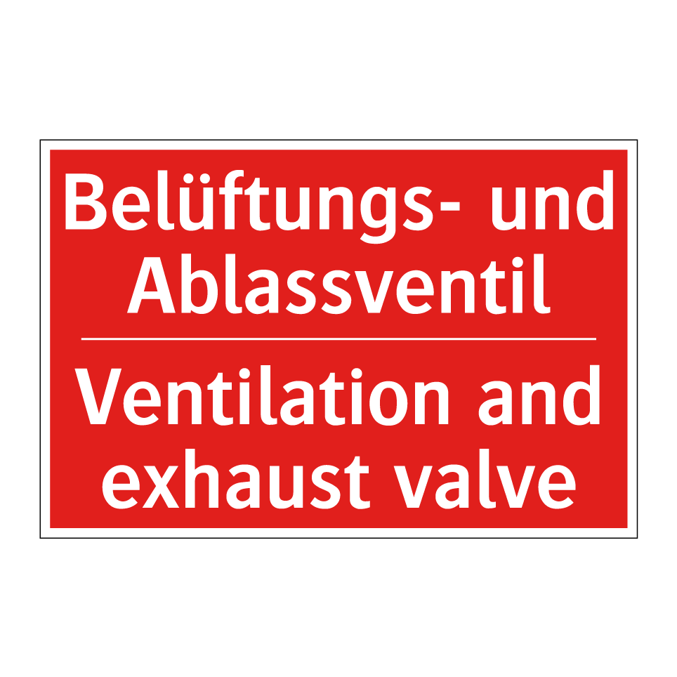 Zweisprachiges Brandschutzschild mit deutschem Text Belüftungs- und Ablassventil und englischem Text Ventilation and exhaust valve