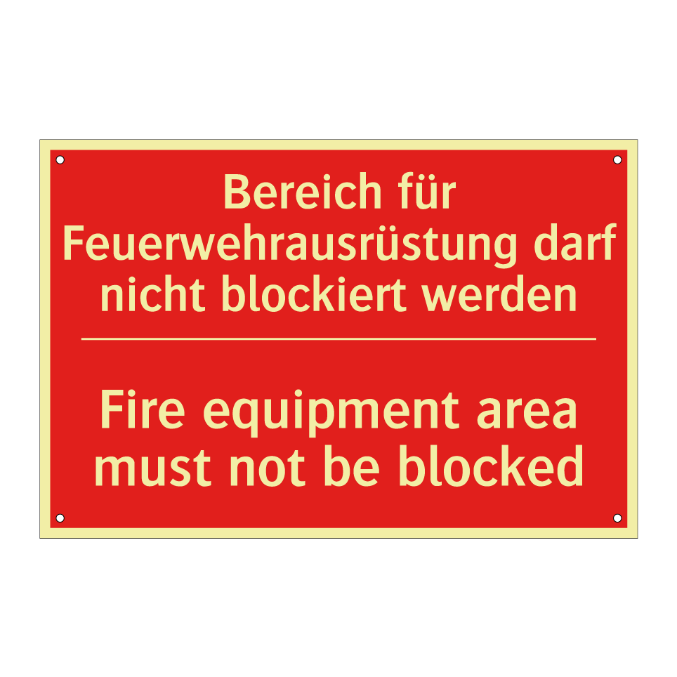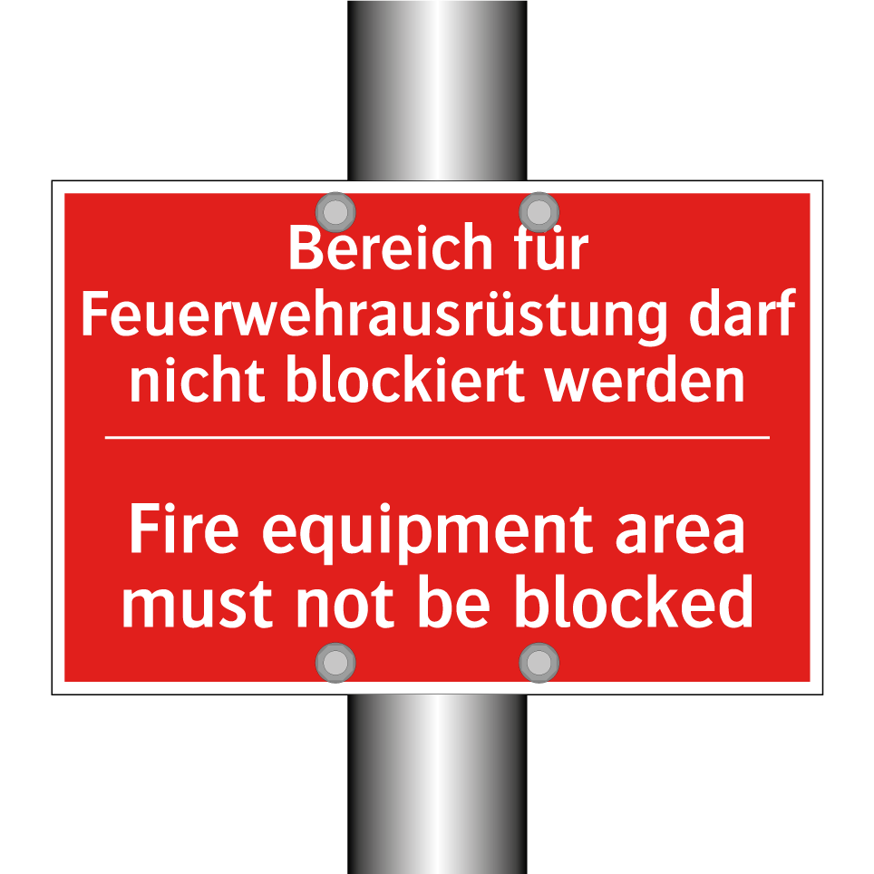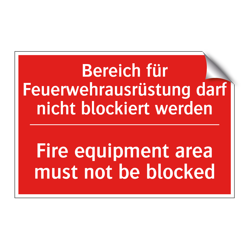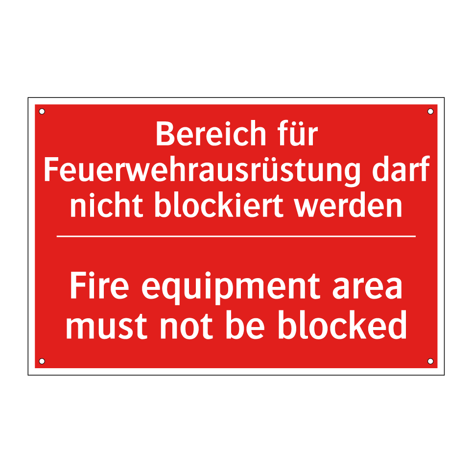 Zweisprachiges Brandschutzschild mit deutschem Text Bereich für Feuerwehrausrüstung darf nicht blockiert werden und englischem Text Fire equipment area must not be blocked