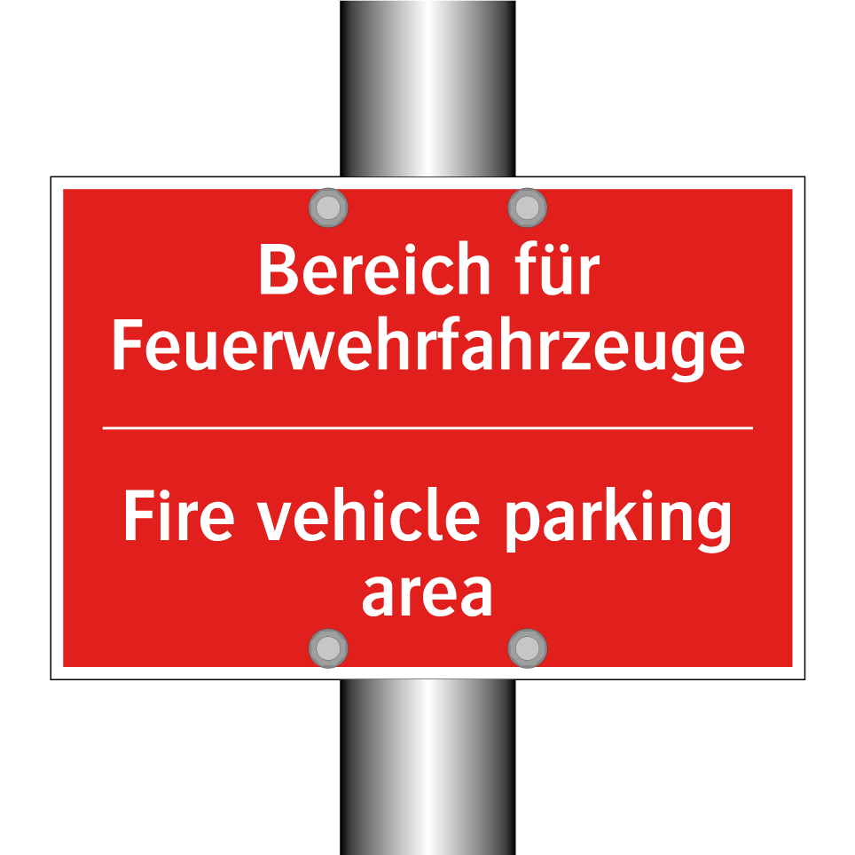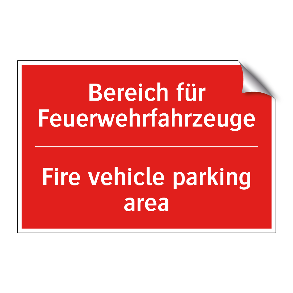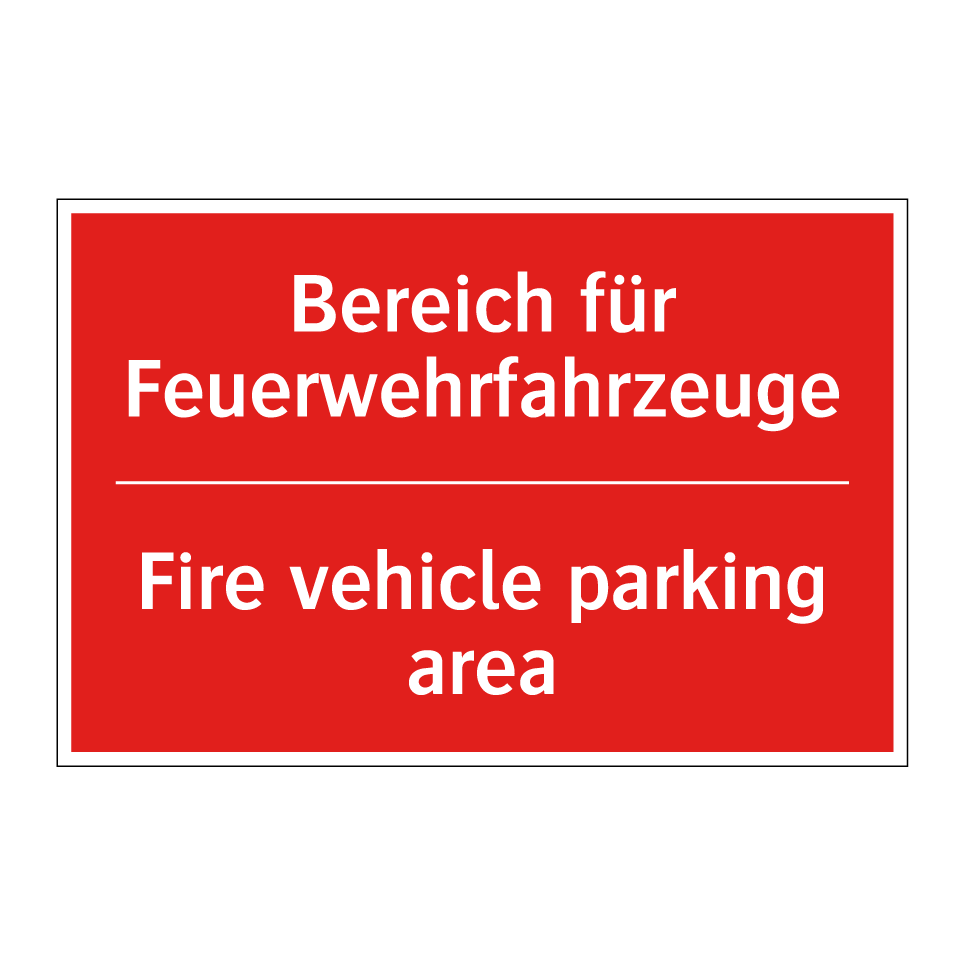 Zweisprachiges Brandschutzschild mit deutschem Text Bereich für Feuerwehrfahrzeuge und englischem Text Fire vehicle parking area