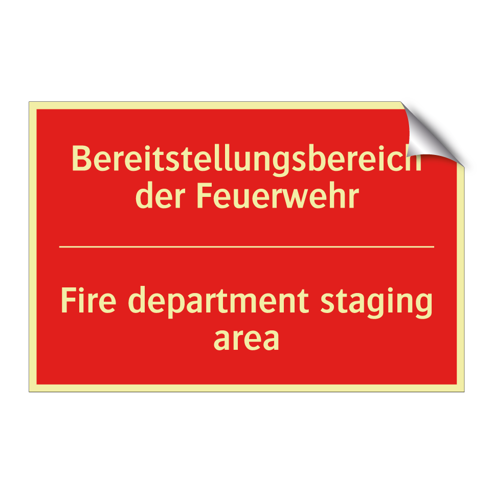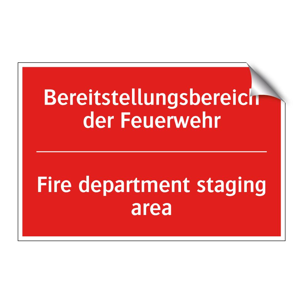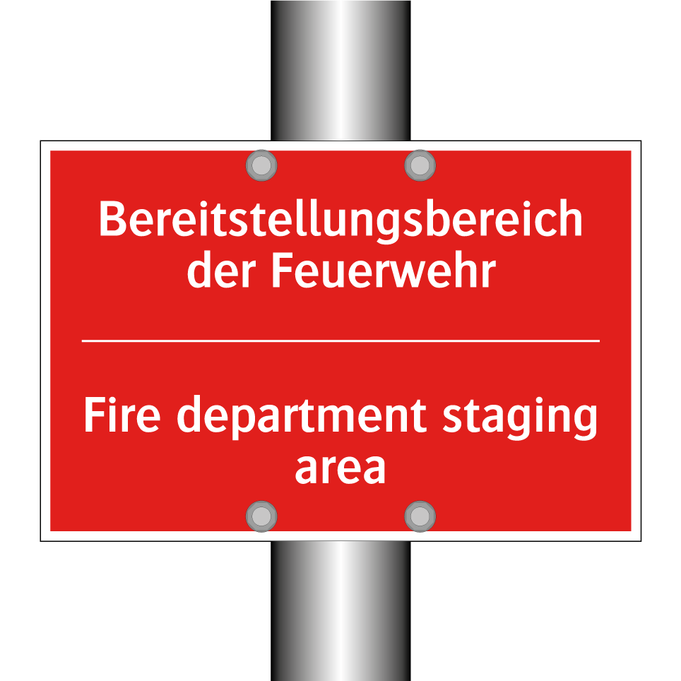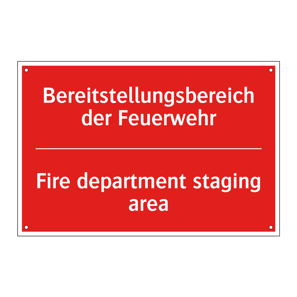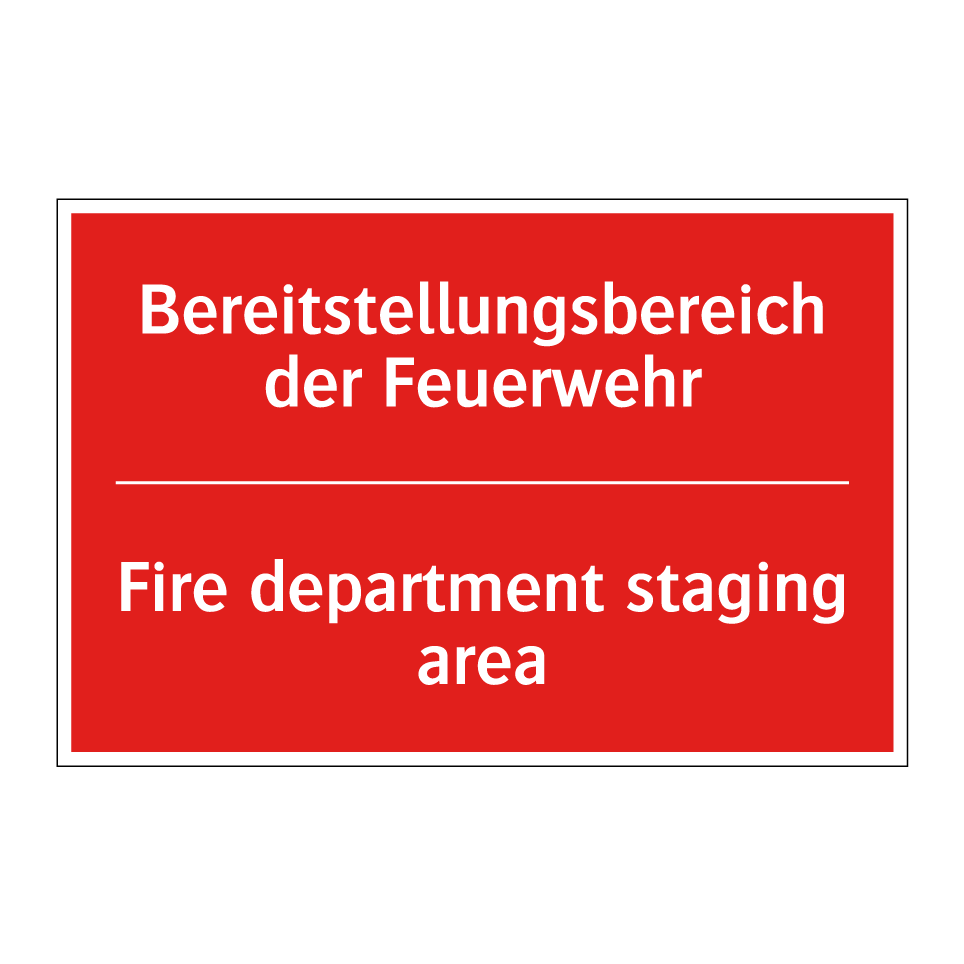 Zweisprachiges Brandschutzschild mit deutschem Text Bereitstellungsbereich der Feuerwehr und englischem Text Fire department staging area