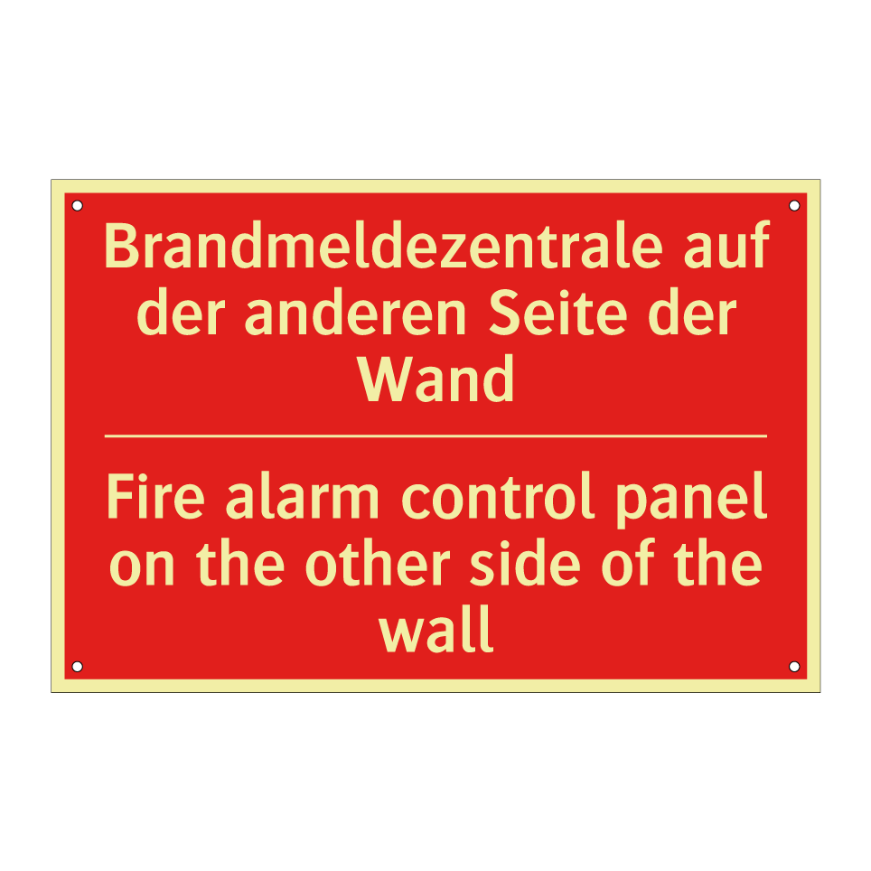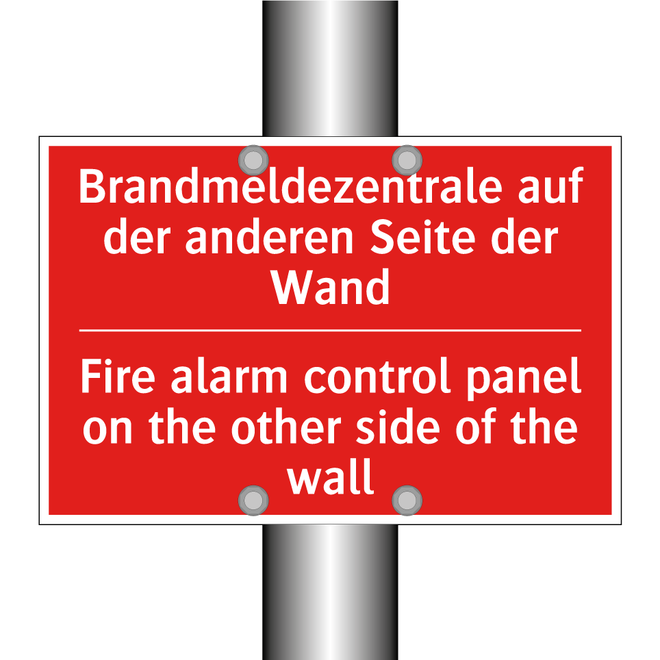 Zweisprachiges Brandschutzschild mit deutschem Text Brandmeldezentrale auf der anderen Seite der Wand und englischem Text Fire alarm control panel on the other side of the wall