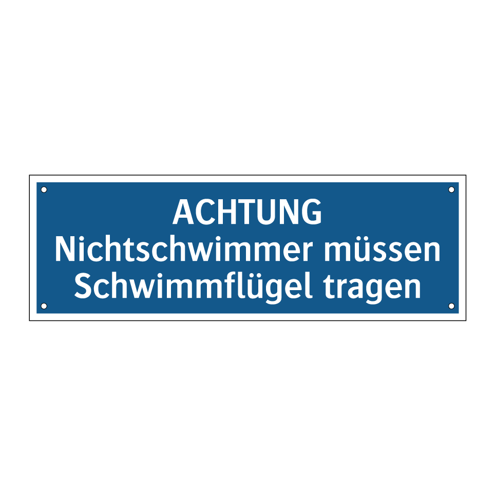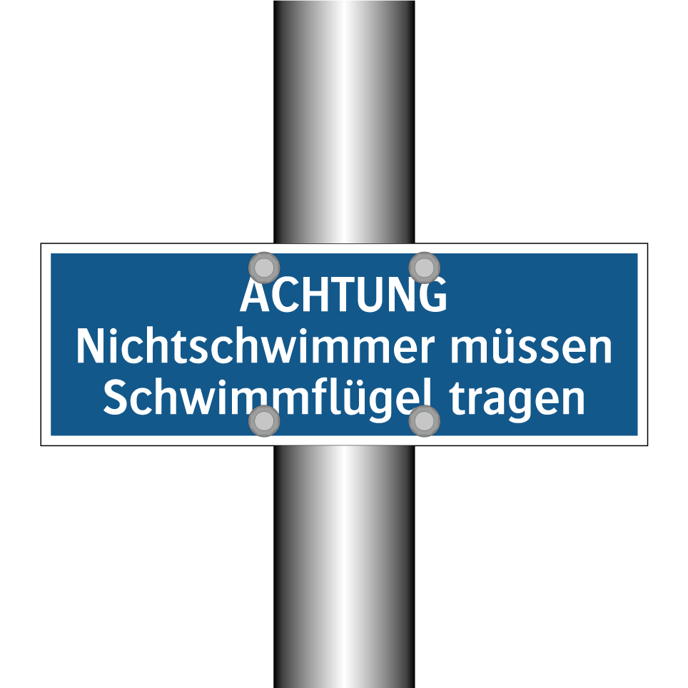 Gebotsschild mit dem Text ACHTUNG Nichtschwimmer müssen Schwimmflügel tragen