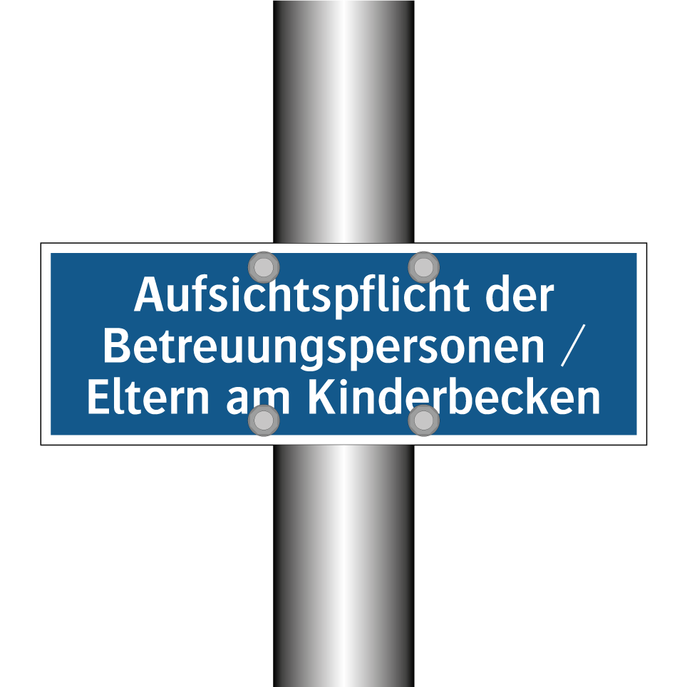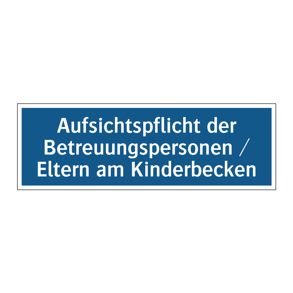 Diese Gebotsschild ist ideal für den Einsatz in Schwimmbädern oder Freizeiteinrichtungen, wo Kinderbecken vorhanden sind. Sie erinnert Eltern und Betreuungspersonen daran, ihre Aufsichtspflicht ernst zu nehmen und stets ein wachsames Auge auf die Kinder zu haben. Die auffällige blaue Hintergrundfarbe mit weißer Schrift sorgt dafür, dass die Botschaft klar und deutlich wahrgenommen wird. Platzieren Sie diese Gebotsschild in der Nähe von Kinderbecken, um die Sicherheit der kleinen Badegäste zu gewährleisten und die Verantwortlichen an ihre wichtige Rolle zu erinnern. Ein unverzichtbares Element für jede Einrichtung, die Wert auf Sicherheit legt.