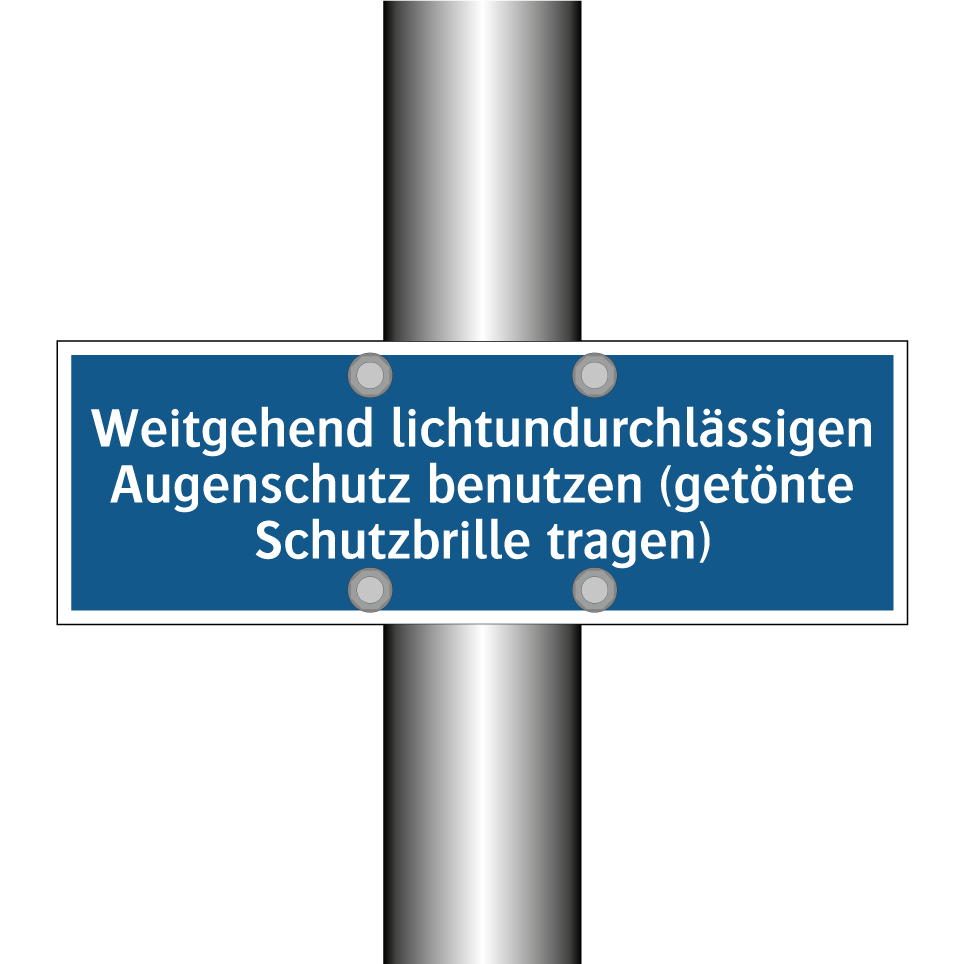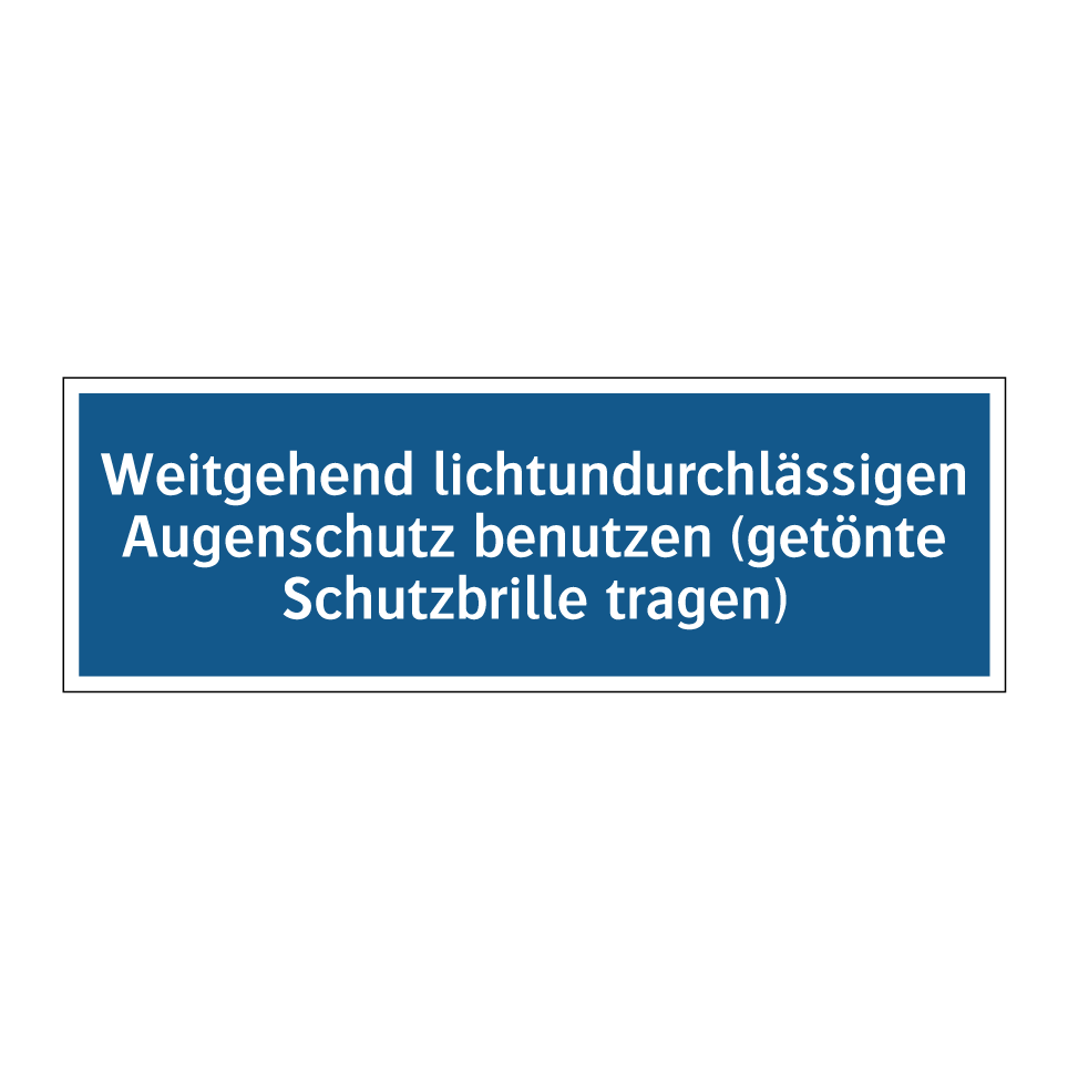 Gebotsschild mit dem Text Weitgehend lichtundurchlässigen Augenschutz benutzen (getönte Schutzbrille tragen)