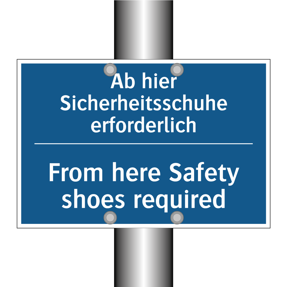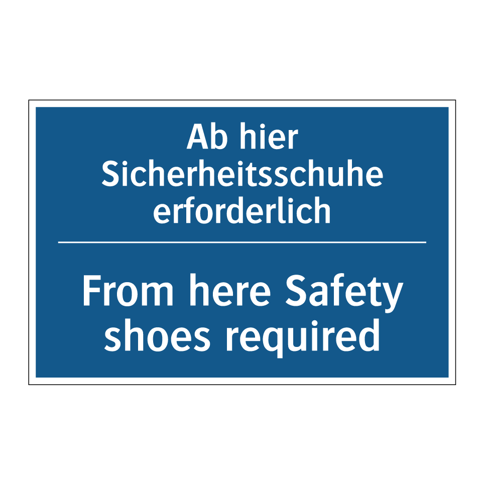 Zweisprachiges Verbotsschild mit deutschem Text Ab hier Sicherheitsschuhe erforderlich und englischem Text From here Safety shoes required