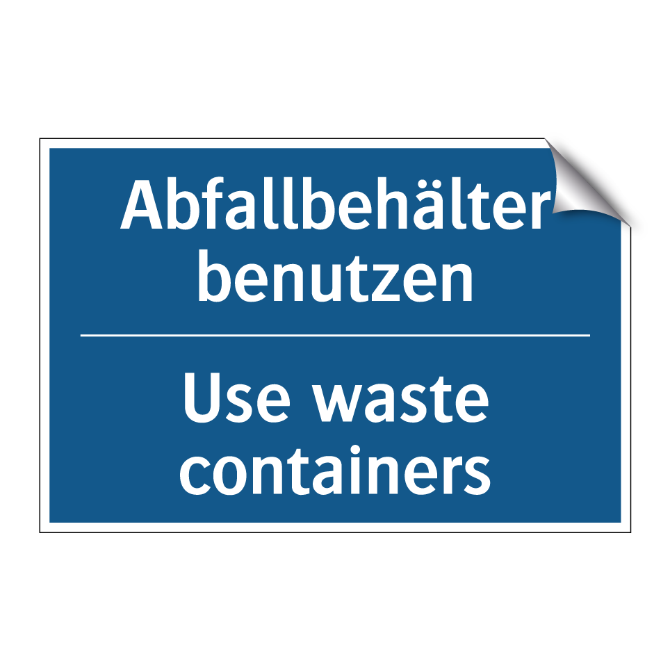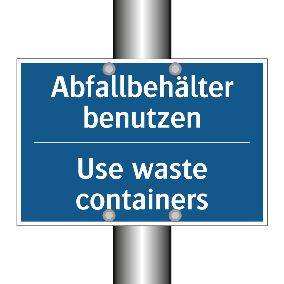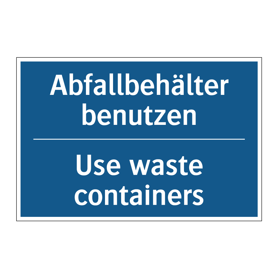 Zweisprachiges Verbotsschild mit deutschem Text Abfallbehälter benutzen und englischem Text Use waste containers