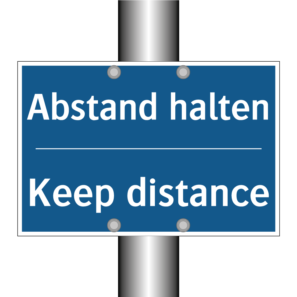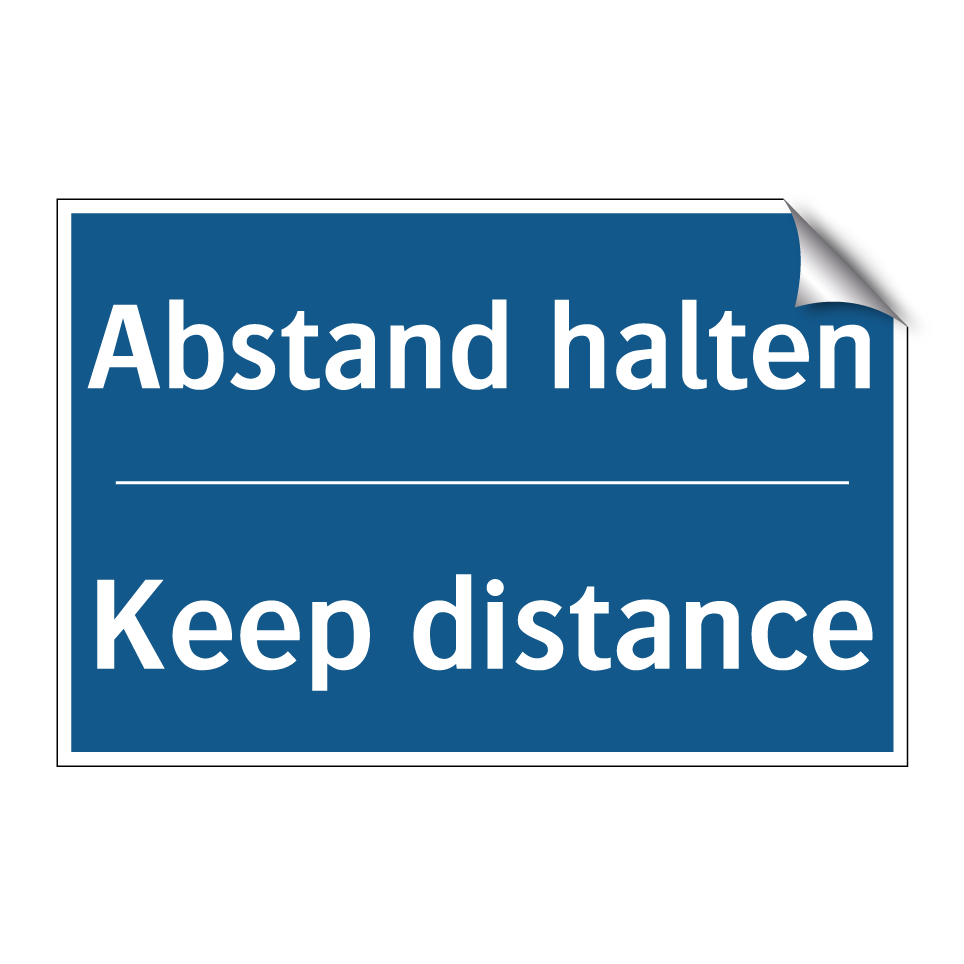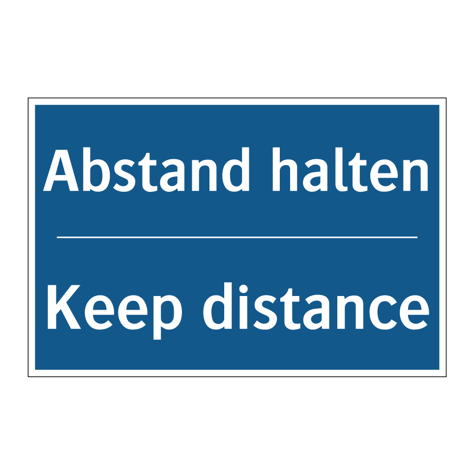 Diese Gebotsschild mit blauem Hintergrund und weißer Schrift ist ideal, um in verschiedenen Umgebungen auf die Notwendigkeit hinzuweisen, Abstand zu halten. Dank der zweisprachigen Beschriftung auf Deutsch und Englisch eignet sich das Schild hervorragend für internationale Umgebungen, in denen sowohl deutsch- als auch englischsprachige Personen verkehren. Es kann in Büros, Geschäften, öffentlichen Verkehrsmitteln oder anderen stark frequentierten Bereichen platziert werden, um die Sicherheit und das Wohlbefinden aller zu gewährleisten. Die klare Botschaft fördert ein verantwortungsbewusstes Verhalten und hilft, die Einhaltung von Sicherheitsmaßnahmen zu unterstützen.