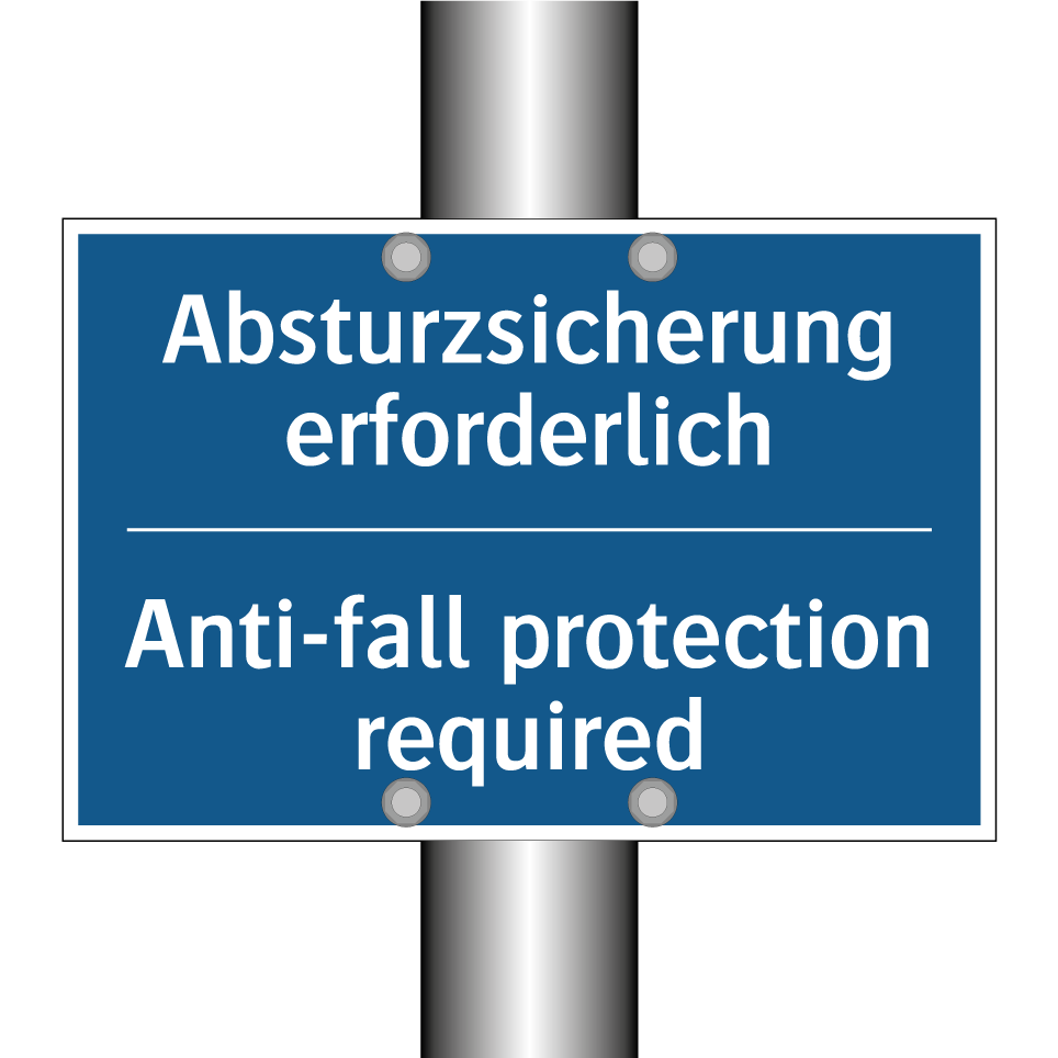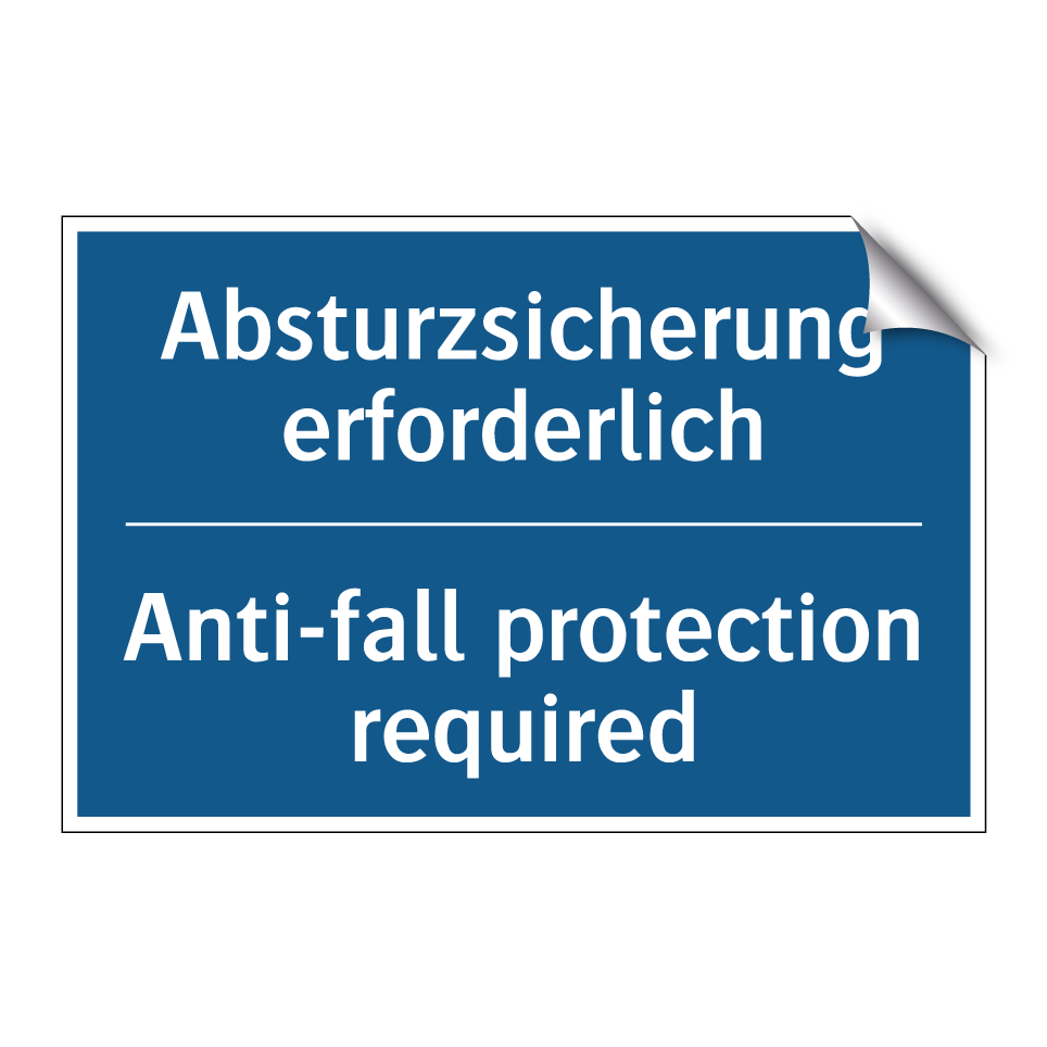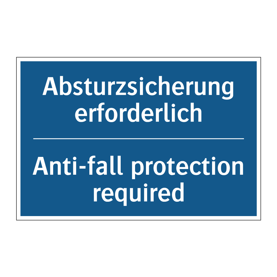 Zweisprachiges Verbotsschild mit deutschem Text Absturzsicherung erforderlich und englischem Text Anti-fall protection required