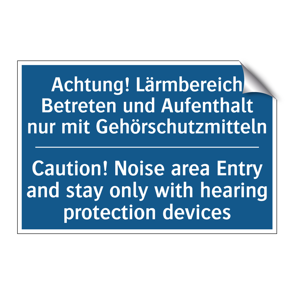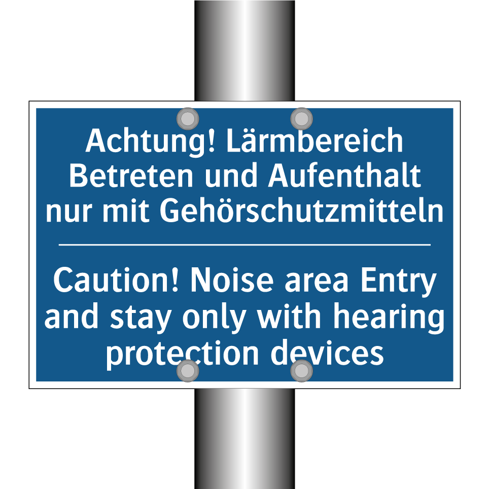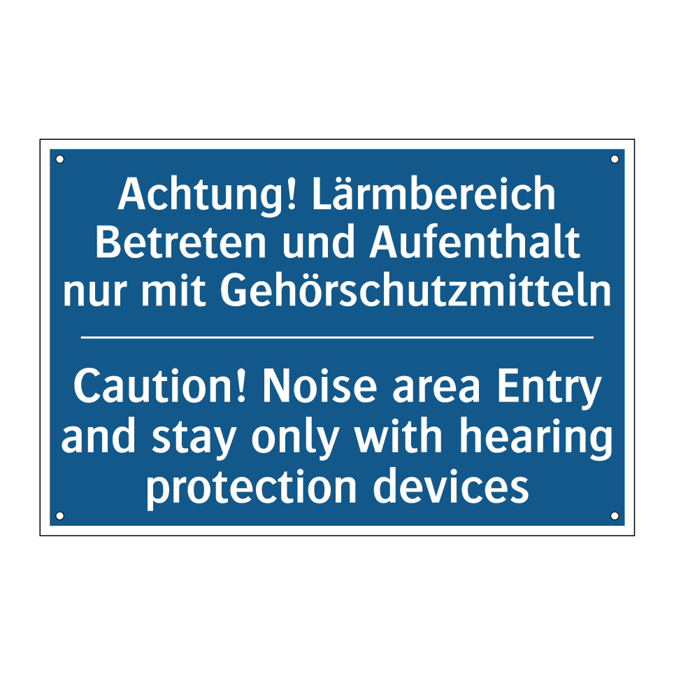 Zweisprachiges Verbotsschild mit deutschem Text Achtung! Lärmbereich Betreten und Aufenthalt nur mit Gehörschutzmitteln und englischem Text Caution! Noise area Entry and stay only with hearing protection devices