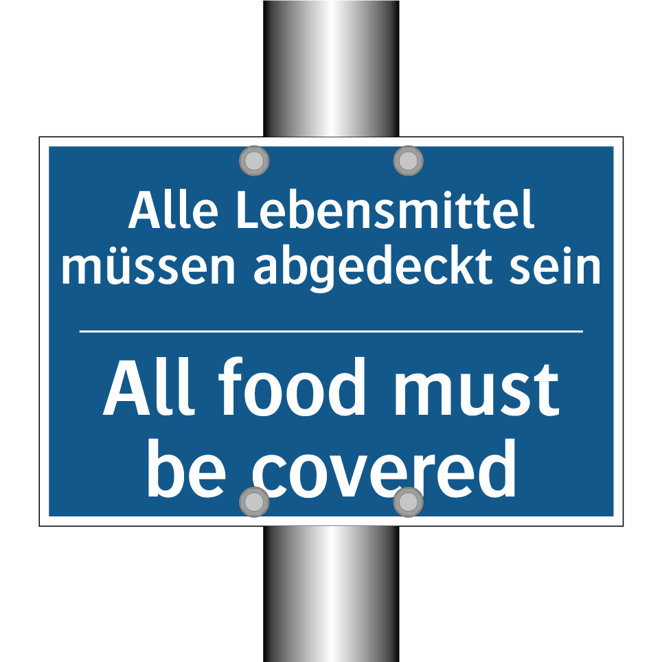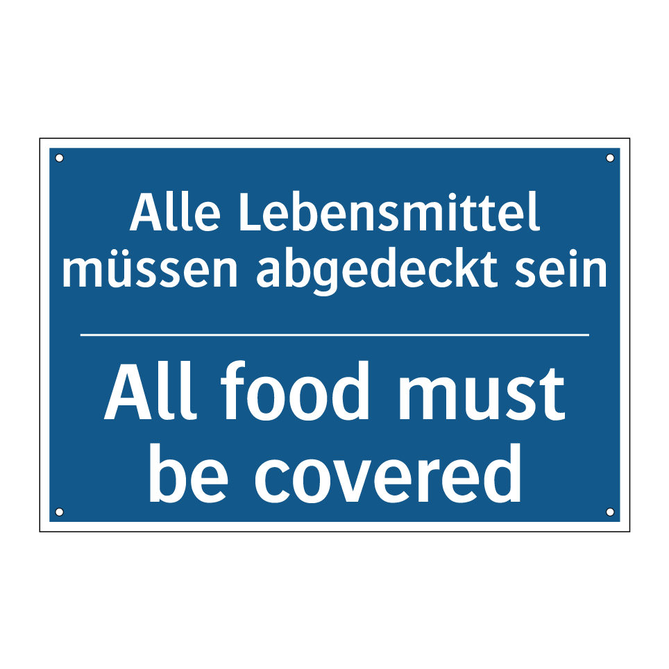 Zweisprachiges Verbotsschild mit deutschem Text Alle Lebensmittel müssen abgedeckt sein und englischem Text All food must be covered