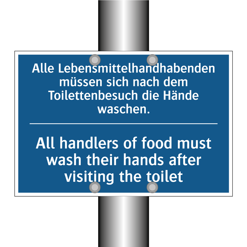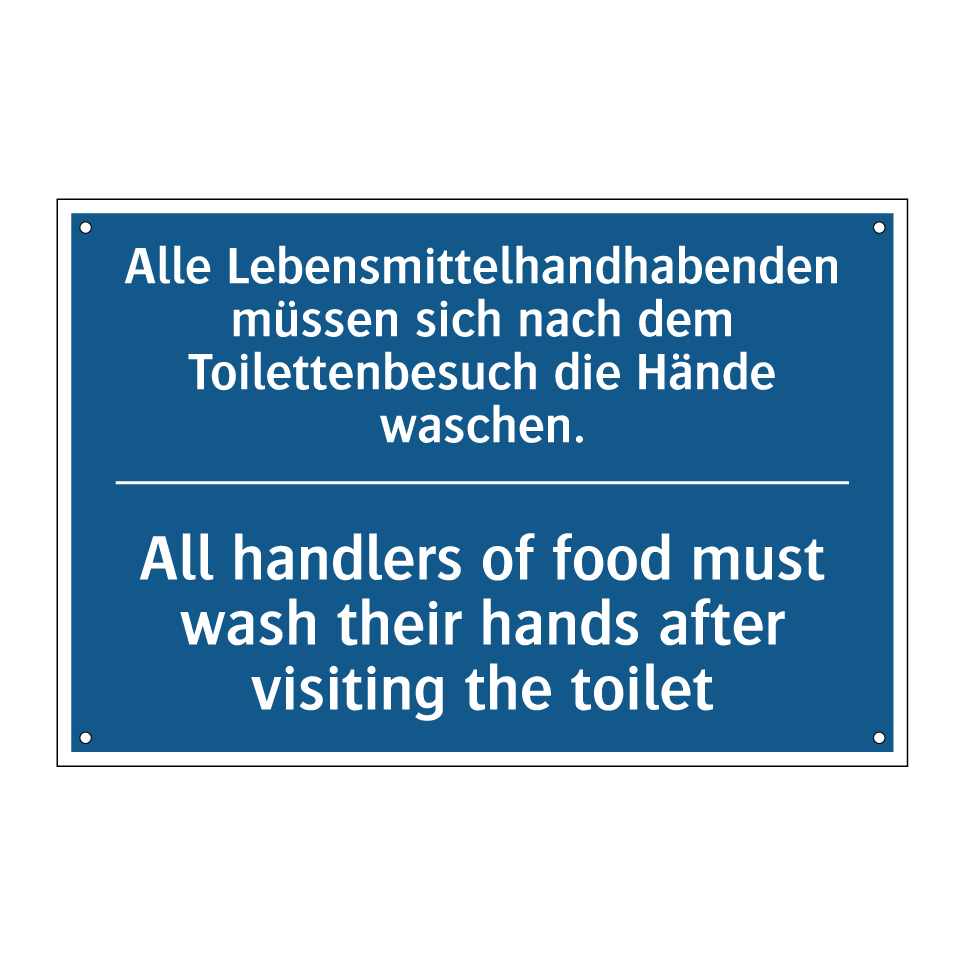 Zweisprachiges Verbotsschild mit deutschem Text Alle Lebensmittelhandhabenden müssen sich nach dem Toilettenbesuch die Hände waschen. und englischem Text All handlers of food must wash their hands after visiting the toilet