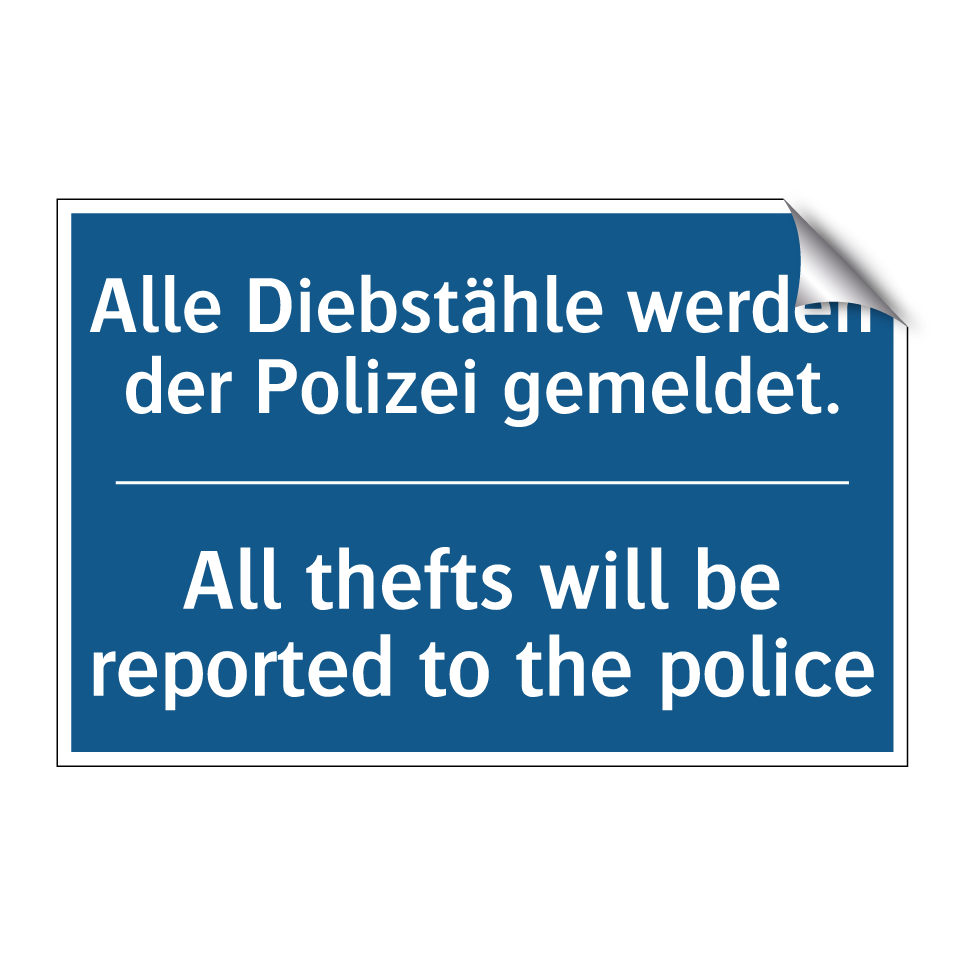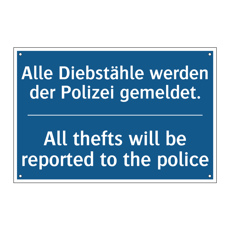 Zweisprachiges Verbotsschild mit deutschem Text Alle Diebstähle werden der Polizei gemeldet. und englischem Text All thefts will be reported to the police