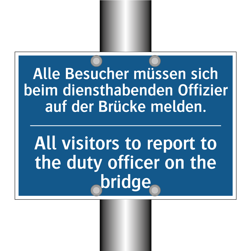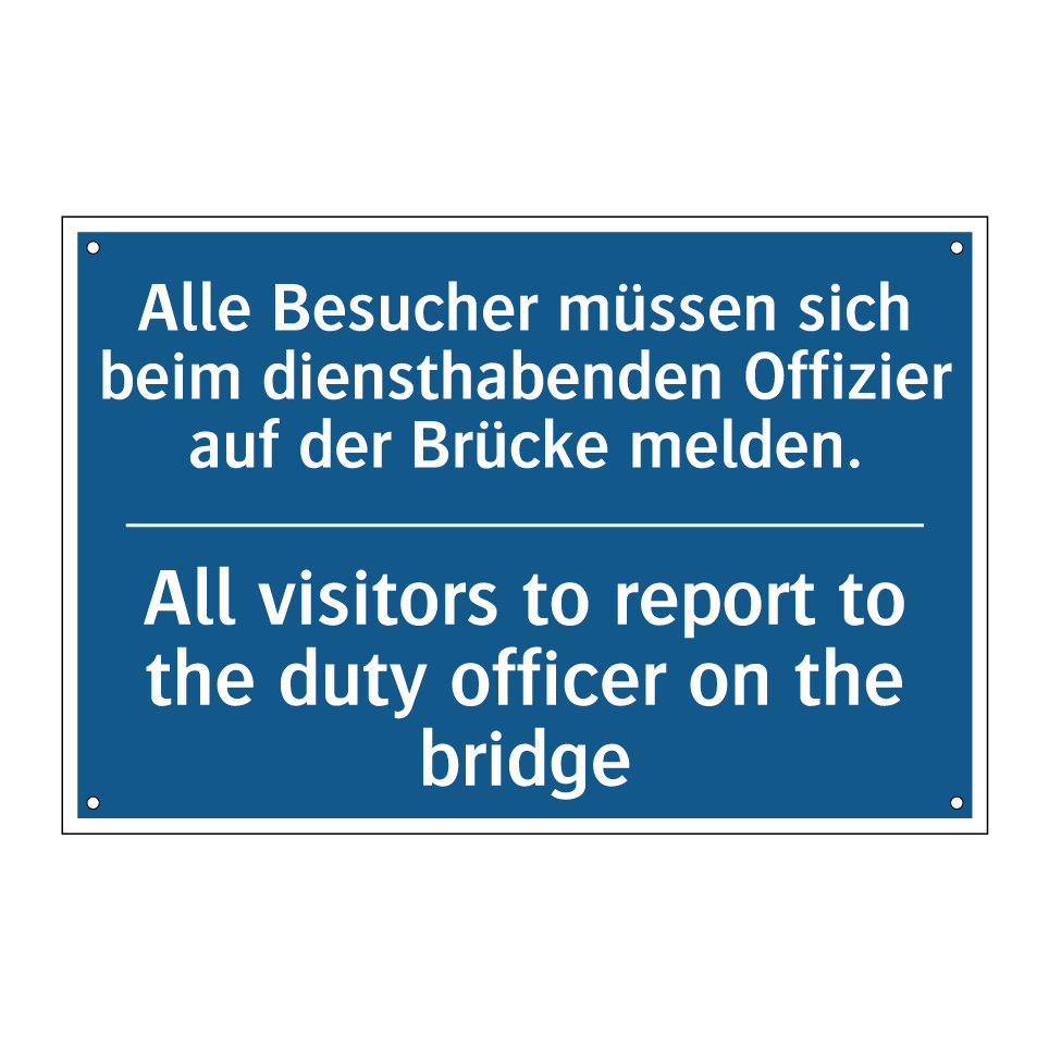 Zweisprachiges Verbotsschild mit deutschem Text Alle Besucher müssen sich beim diensthabenden Offizier auf der Brücke melden. und englischem Text All visitors to report to the duty officer on the bridge