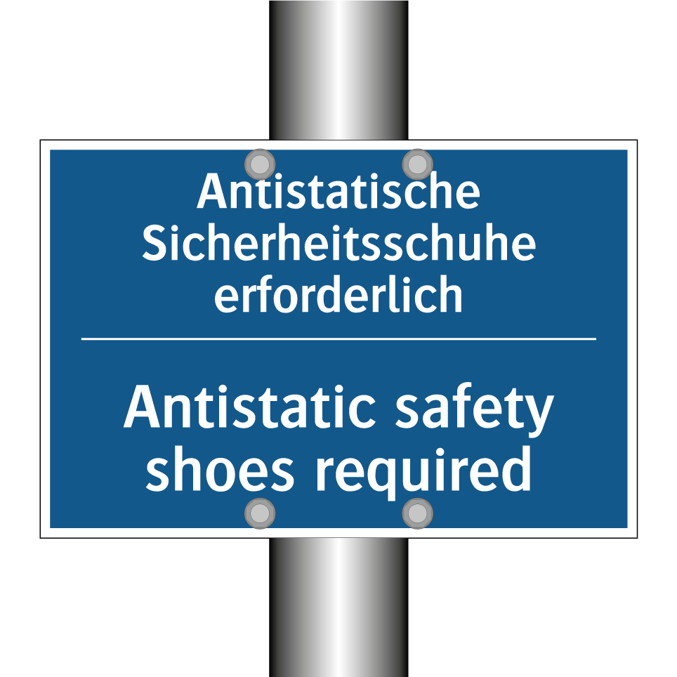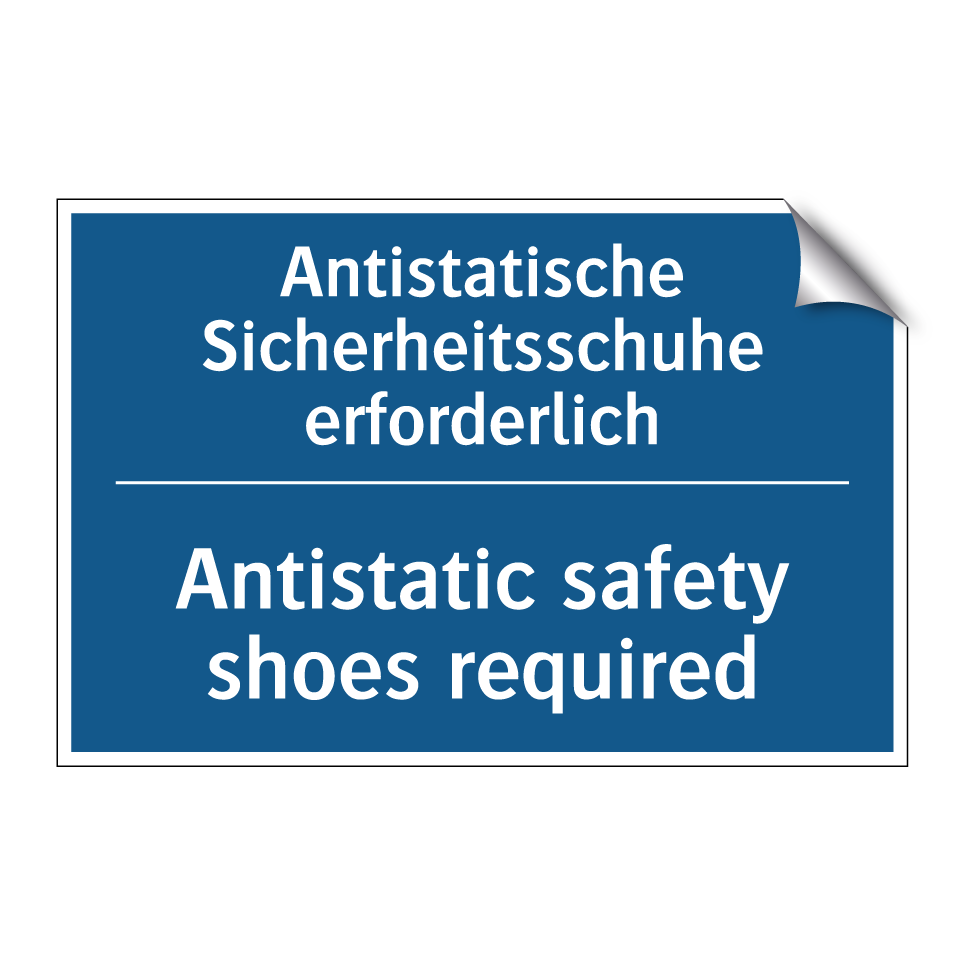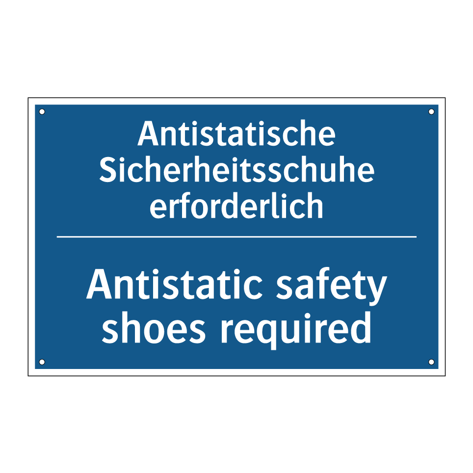 Zweisprachiges Verbotsschild mit deutschem Text Antistatische Sicherheitsschuhe erforderlich und englischem Text Antistatic safety shoes required