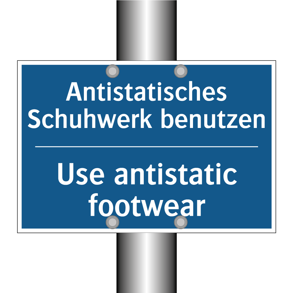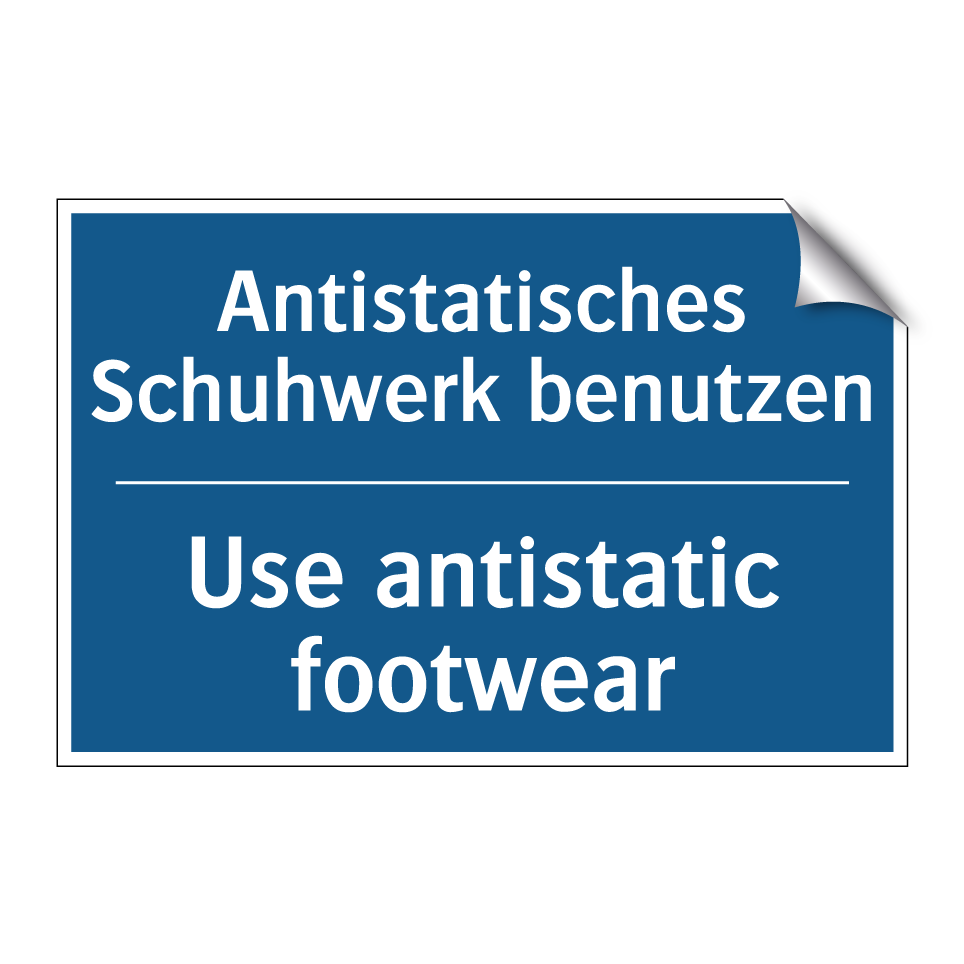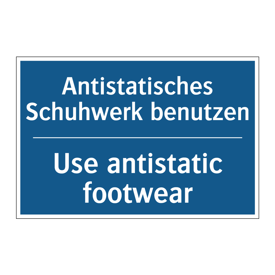 Zweisprachiges Verbotsschild mit deutschem Text Antistatisches Schuhwerk benutzen und englischem Text Use antistatic footwear
