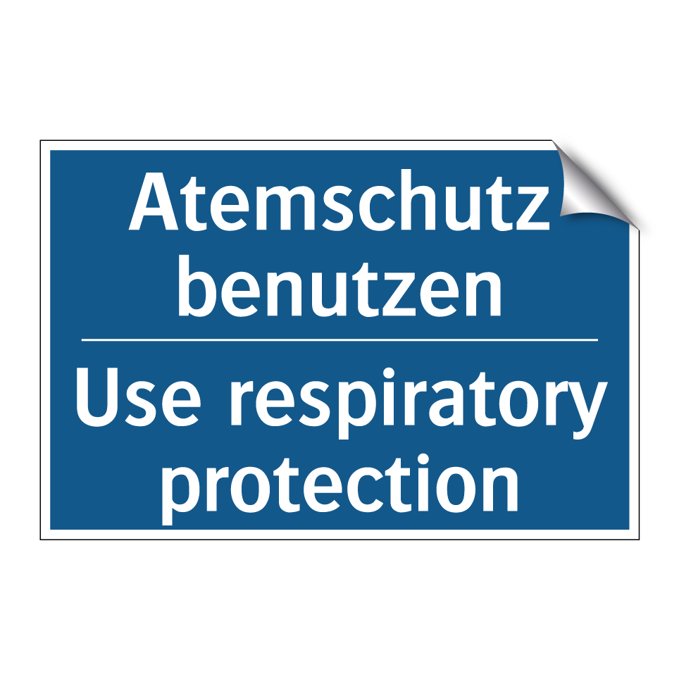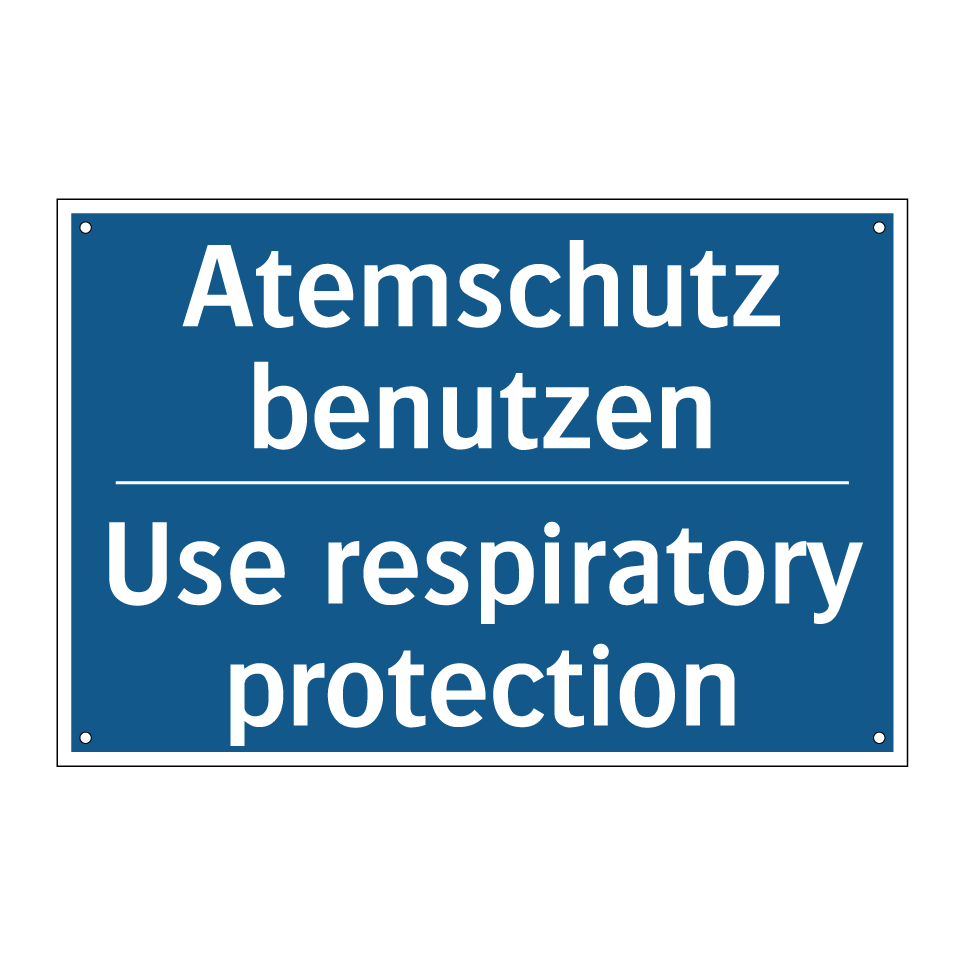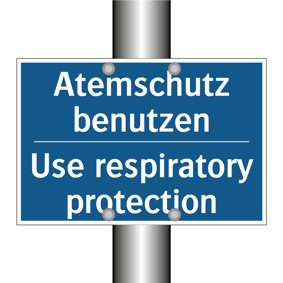 Zweisprachiges Verbotsschild mit deutschem Text Atemschutz benutzen und englischem Text Use respiratory protection