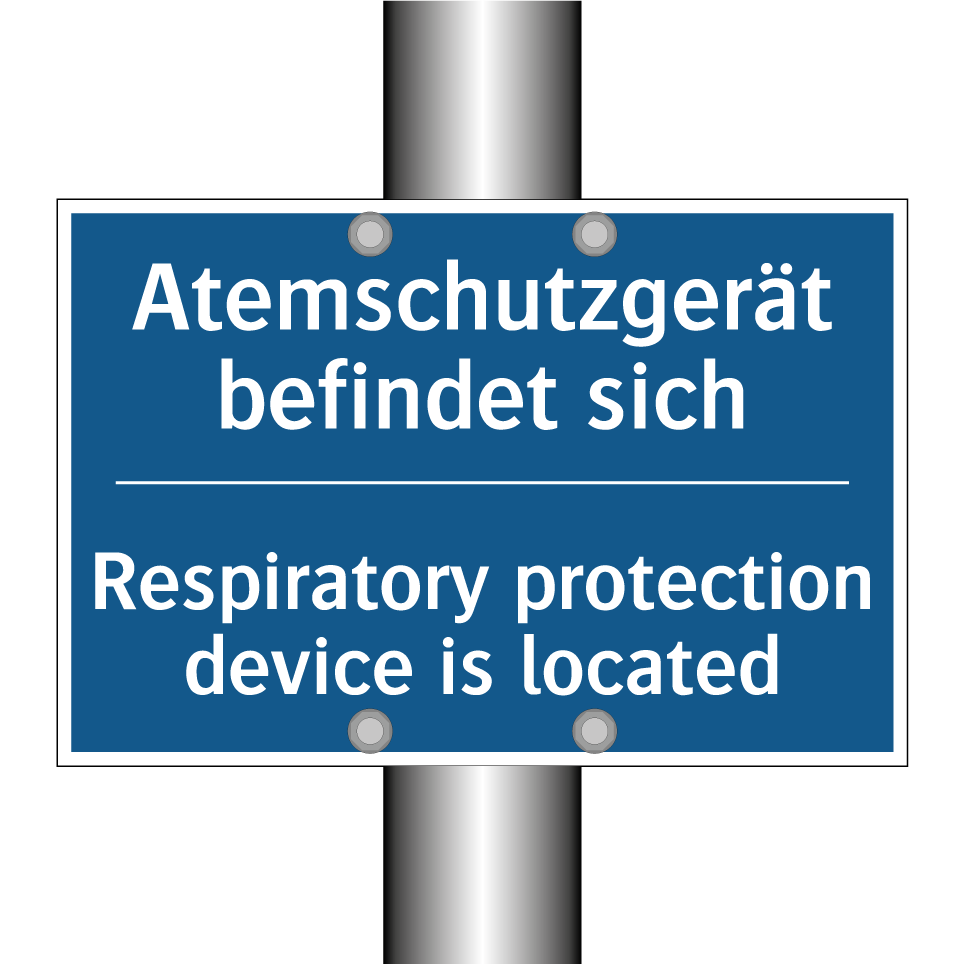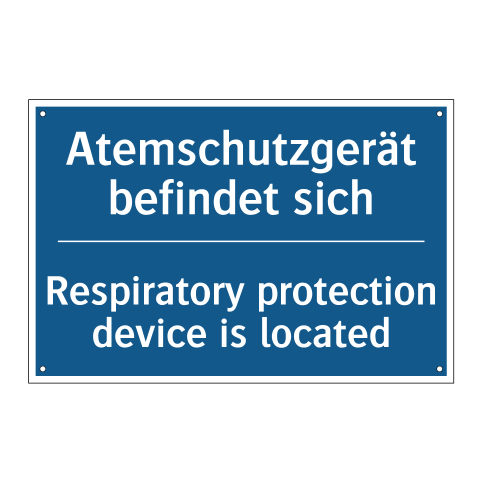 Zweisprachiges Verbotsschild mit deutschem Text Atemschutzgerät befindet sich und englischem Text Respiratory protection device is located