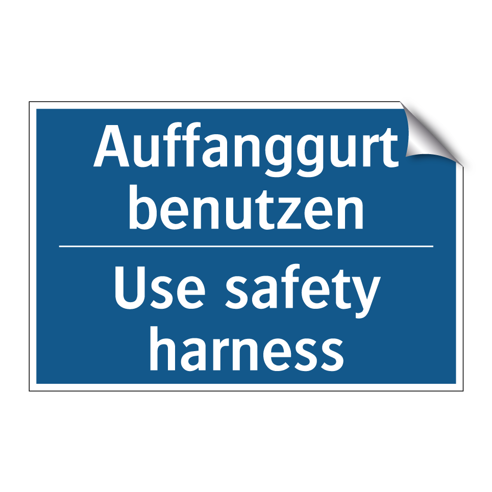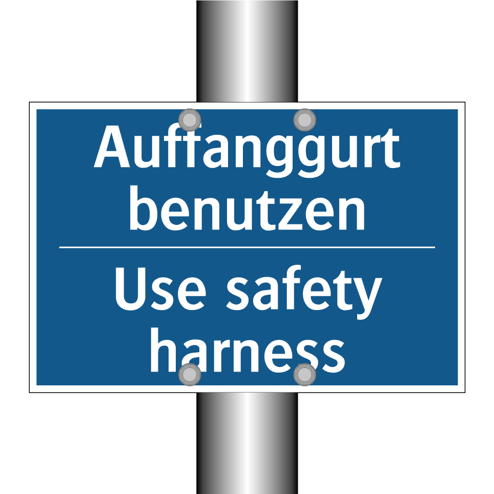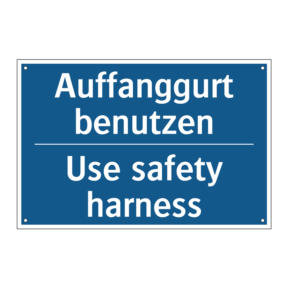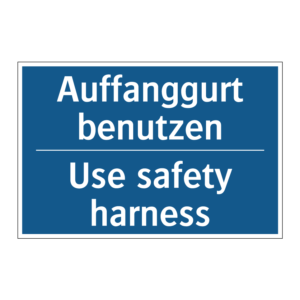 Zweisprachiges Verbotsschild mit deutschem Text Auffanggurt benutzen und englischem Text Use safety harness