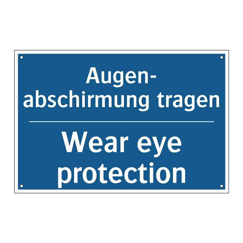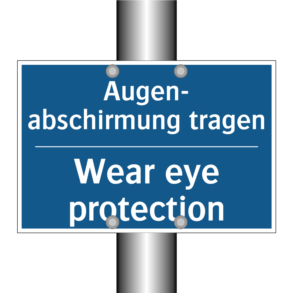 Zweisprachiges Verbotsschild mit deutschem Text Augen- abschirmung tragen und englischem Text Wear eye protection
