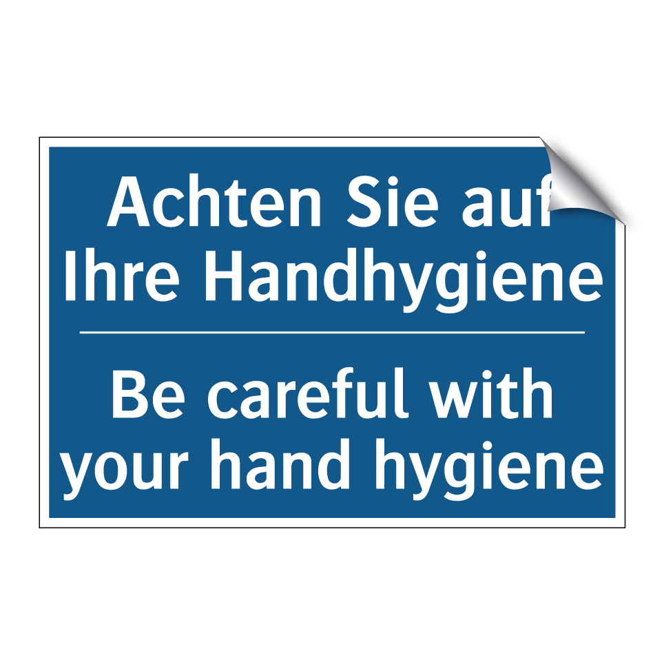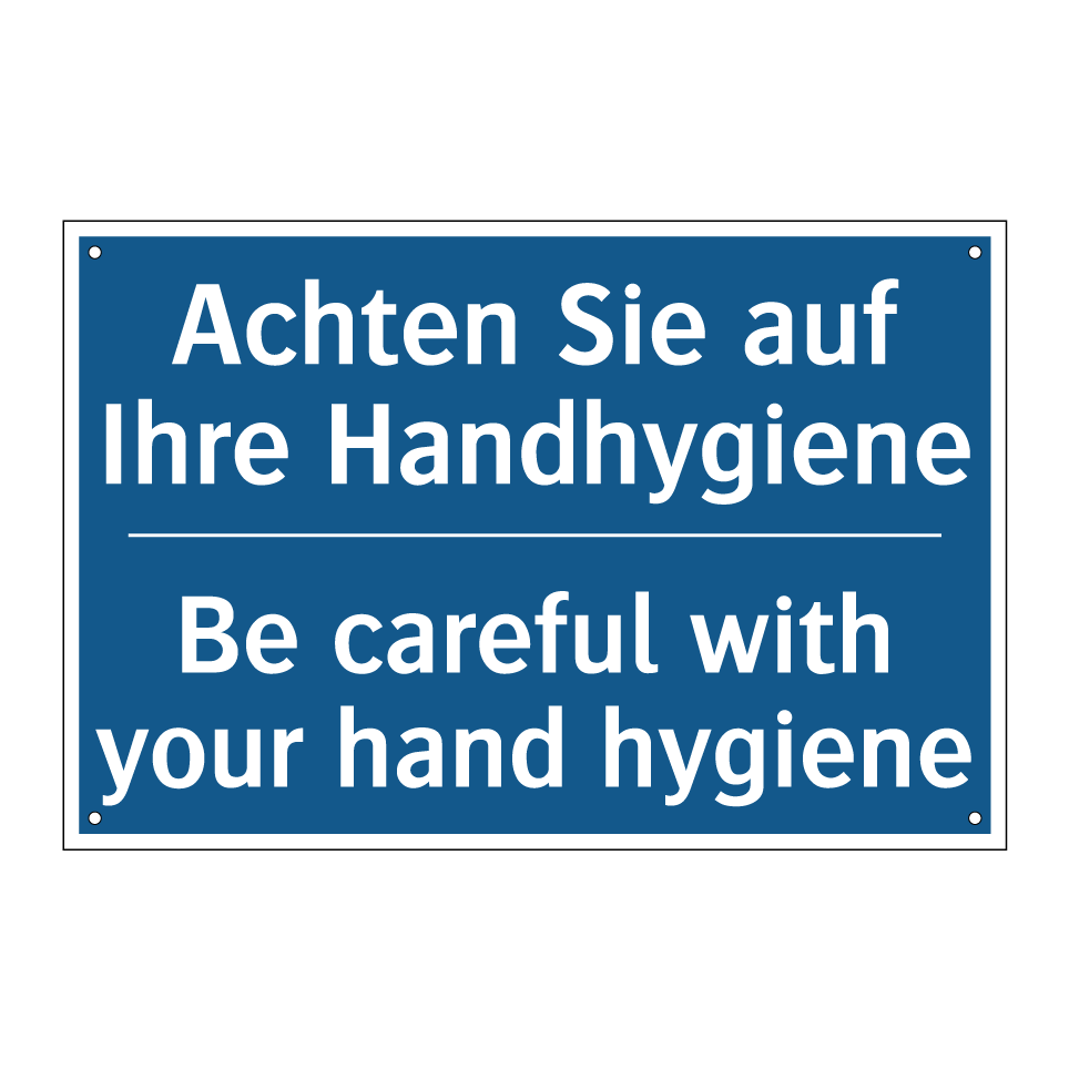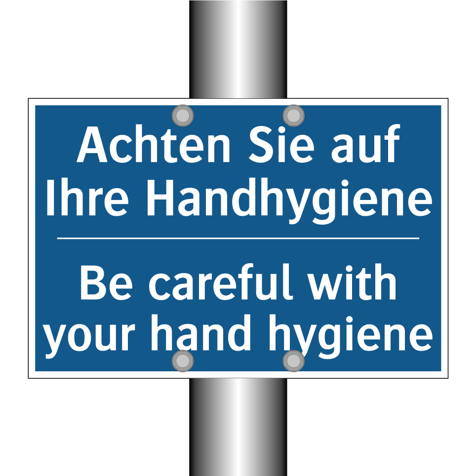 Zweisprachiges Verbotsschild mit deutschem Text Achten Sie auf Ihre Handhygiene und englischem Text Be careful with your hand hygiene