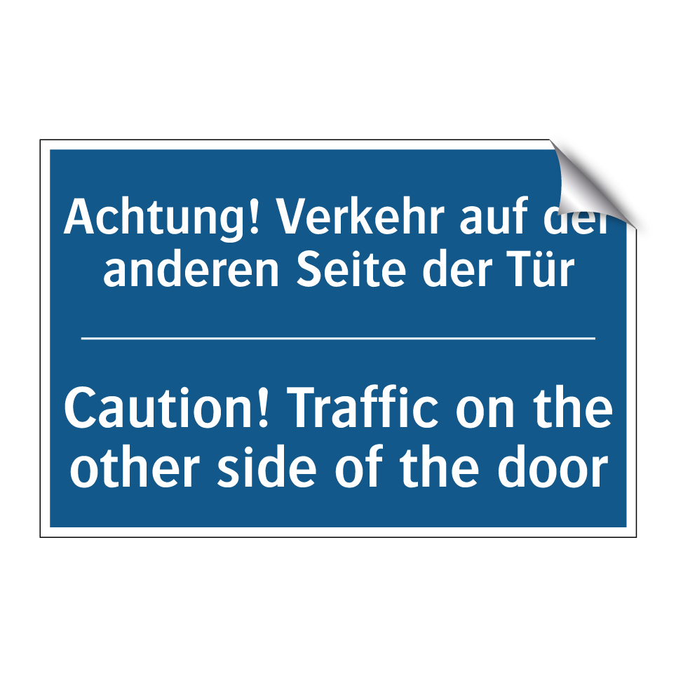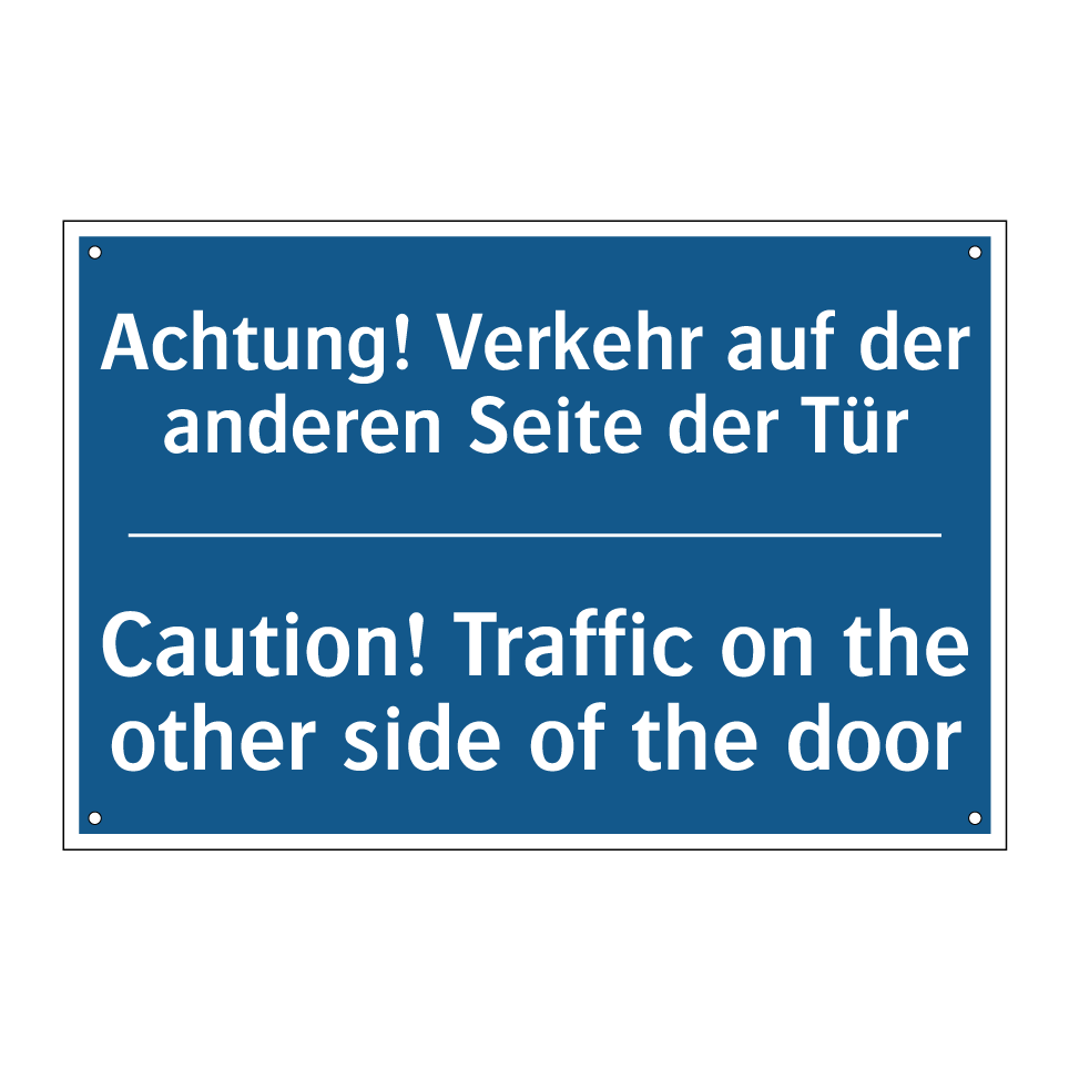 Zweisprachiges Verbotsschild mit deutschem Text Achtung! Verkehr auf der anderen Seite der Tür und englischem Text Caution! Traffic on the other side of the door