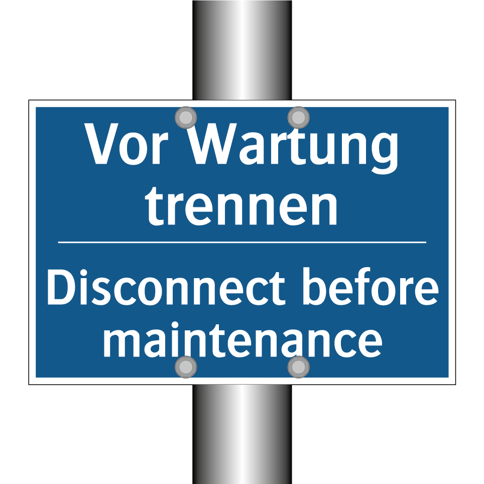 Zweisprachiges Verbotsschild mit deutschem Text Vor Wartung trennen und englischem Text Disconnect before maintenance