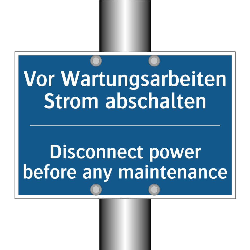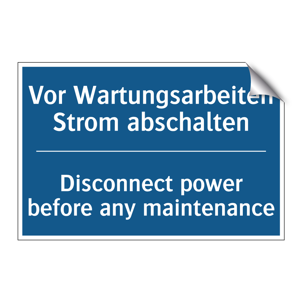 Zweisprachiges Verbotsschild mit deutschem Text Vor Wartungsarbeiten Strom abschalten und englischem Text Disconnect power before any maintenance
