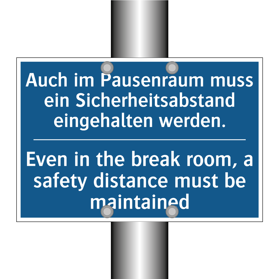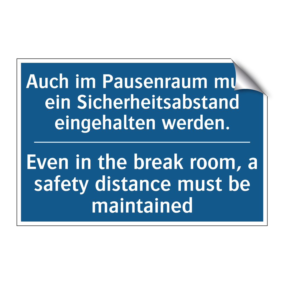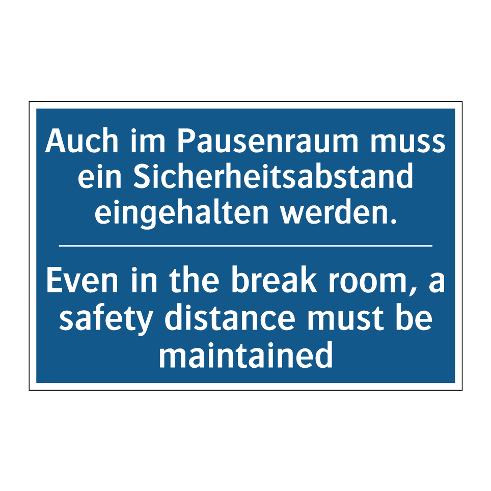 Zweisprachiges Verbotsschild mit deutschem Text Auch im Pausenraum muss ein Sicherheitsabstand eingehalten werden. und englischem Text Even in the break room, a safety distance must be maintained