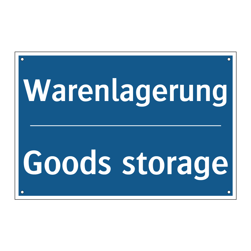 Zweisprachiges Verbotsschild mit deutschem Text Warenlagerung und englischem Text Goods storage