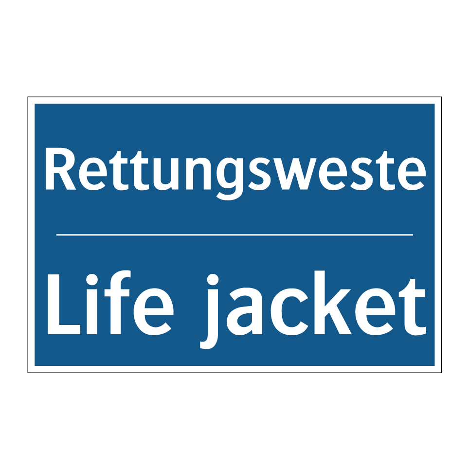 Zweisprachiges Verbotsschild mit deutschem Text Rettungsweste und englischem Text Life jacket