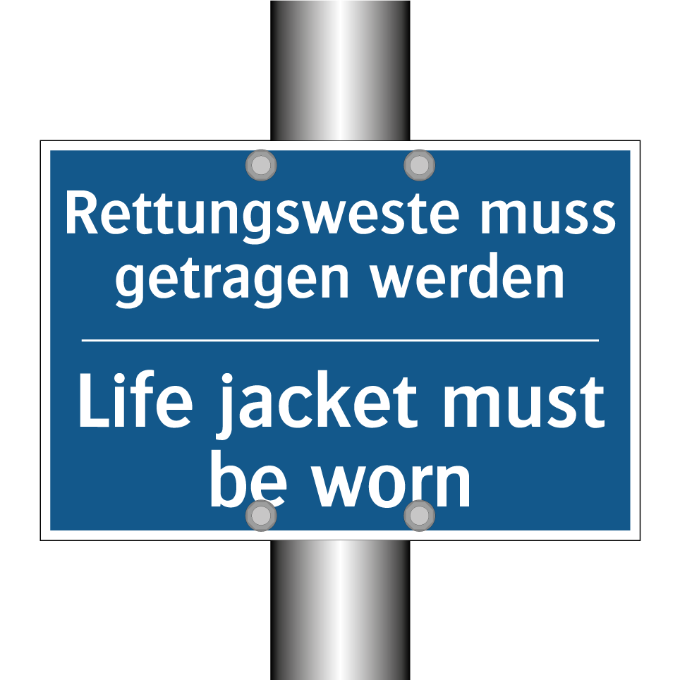Zweisprachiges Verbotsschild mit deutschem Text Rettungsweste muss getragen werden und englischem Text Life jacket must be worn