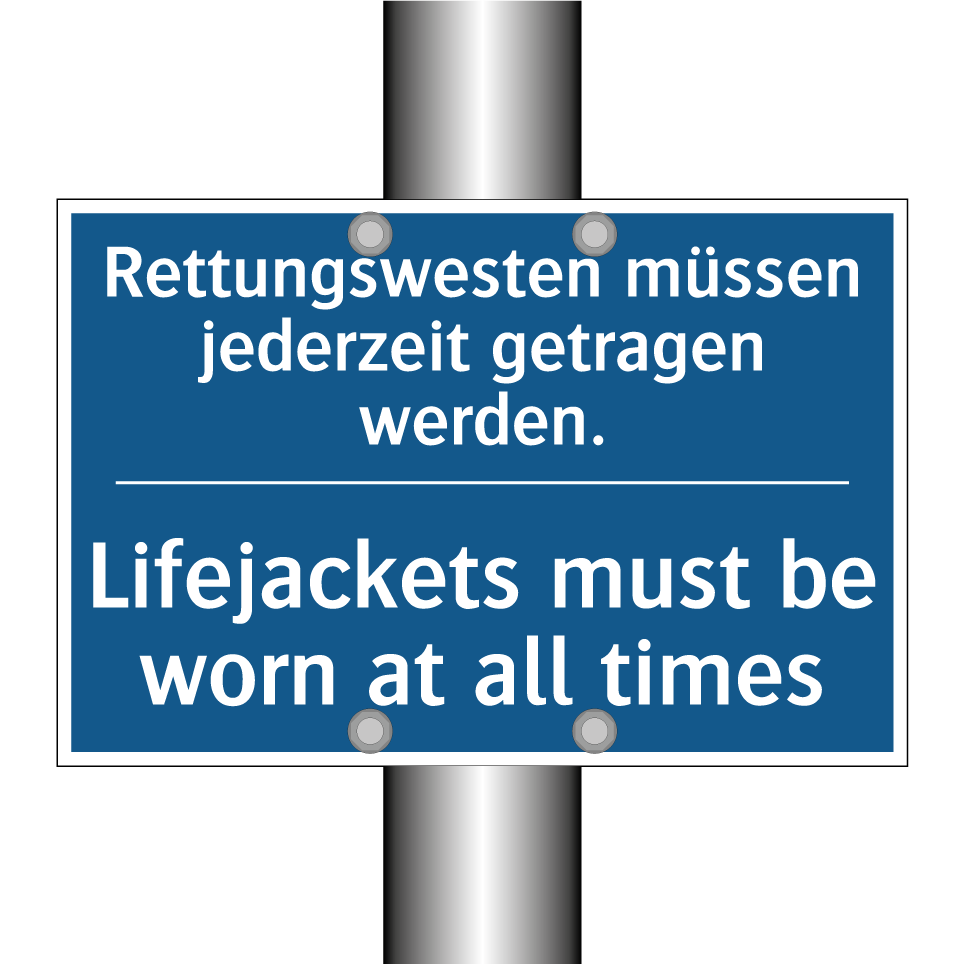 Zweisprachiges Verbotsschild mit deutschem Text Rettungswesten müssen jederzeit getragen werden. und englischem Text Lifejackets must be worn at all times