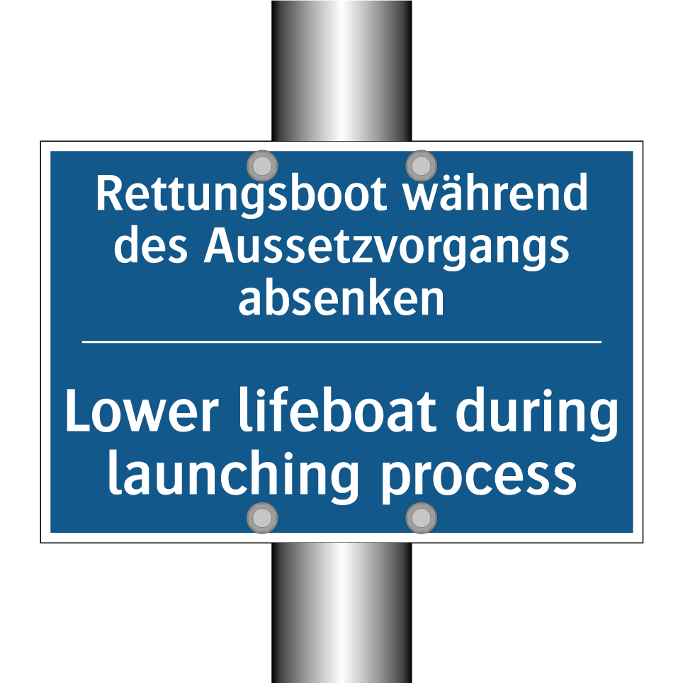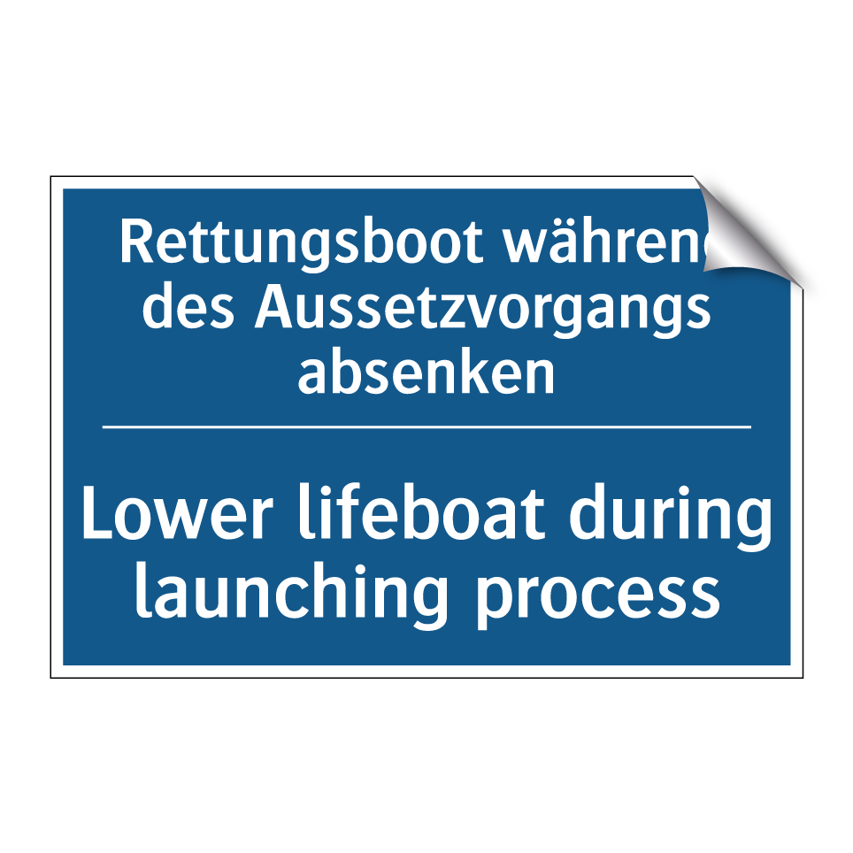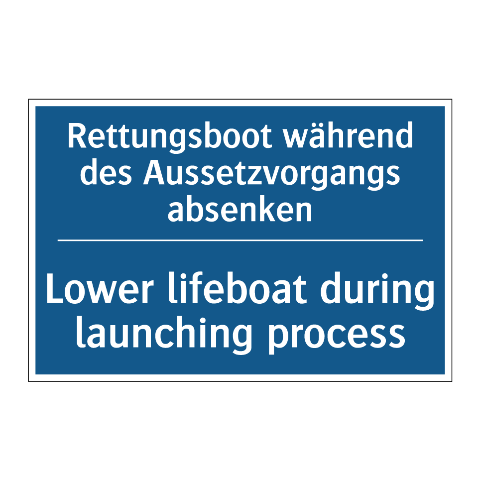 Entdecken Sie die Vielseitigkeit dieser Gebotsschild, die speziell für den Einsatz in Notfallsituationen entwickelt wurde. Mit ihrer klaren blauen Hintergrundfarbe und der deutlichen weißen Schrift sorgt sie für sofortige Aufmerksamkeit und klare Anweisungen. Diese zweisprachige Beschilderung, die sowohl auf Deutsch als auch auf Englisch verfasst ist, bietet den Vorteil, dass sie von einem breiten Publikum verstanden wird, was besonders in internationalen Umgebungen von Bedeutung ist. Ideal für den Einsatz auf Schiffen, in Häfen oder anderen maritimen Einrichtungen, weist sie darauf hin, dass das Rettungsboot während des Aussetzvorgangs abgesenkt werden muss. Platzieren Sie diese Gebotsschild an gut sichtbaren Stellen, um die Sicherheit und das ordnungsgemäße Vorgehen in Notfallsituationen zu gewährleisten.