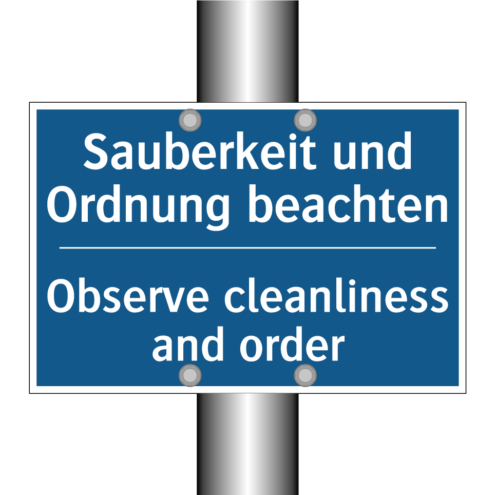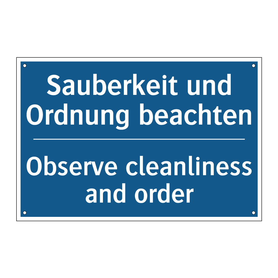 Zweisprachiges Verbotsschild mit deutschem Text Sauberkeit und Ordnung beachten und englischem Text Observe cleanliness and order