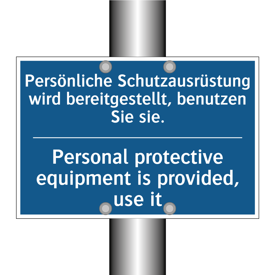 Zweisprachiges Verbotsschild mit deutschem Text Persönliche Schutzausrüstung wird bereitgestellt, benutzen Sie sie. und englischem Text Personal protective equipment is provided, use it