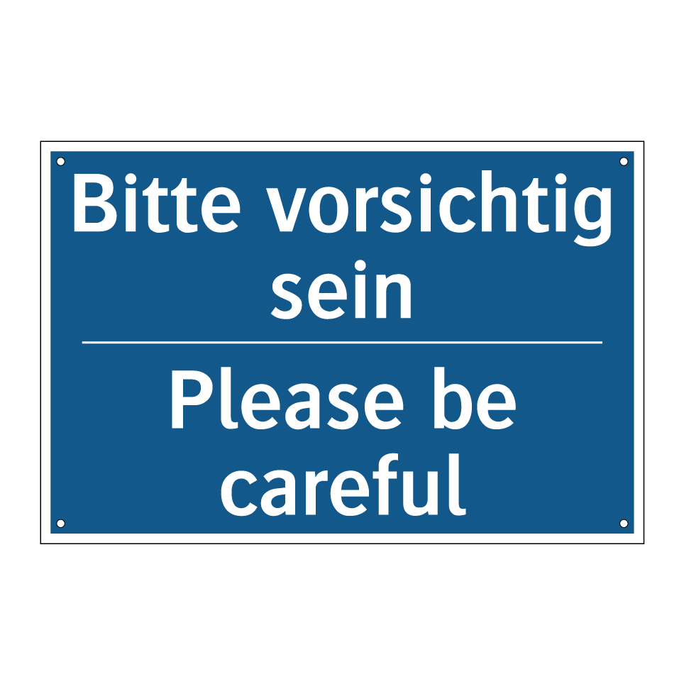 Zweisprachiges Verbotsschild mit deutschem Text Bitte vorsichtig sein und englischem Text Please be careful